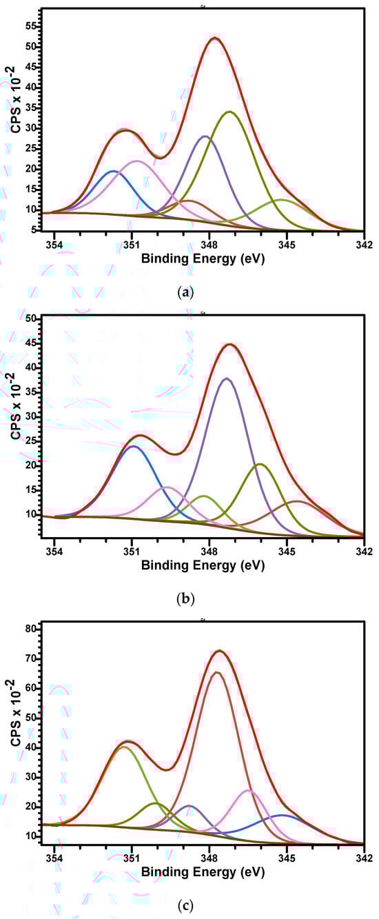 The high-resolution XPS spectra of Ca2p for samples are presented in Figure 7a–c. Three doublets for Ca2p, corresponding each doublet to 2p3/2 and 2p1/2 split, spaced at approximately 3.55 eV and with an area ratio 1:2, were used to fit the signals. The Ca 2p3/2 binding energy values were observed as follows: at 345.18, 347.19, and 348.13 eV (sample M); at 345.15, 346.47, and 347.68 eV (sample M_Al5) and 345.1, 346.02, and 347.32 eV (M_Al10). The binding energies are specific to biphasic calcium phosphate materials, but a specific association of the signal is difficult since the divalent Ca2+ occupied two sites in HAp and five sites in β-TCP structures [65]. This peculiarity generates differences in their electronic structures and therefore differences in their atomic binding energies. We attribute the Ca 2p3/2 component characteristic of CaCO3 to the lower BE (~345.1), whereas the higher BEs are consistent with Ca in calcium-phosphate (BCP: HAp/β-TCP) environments.