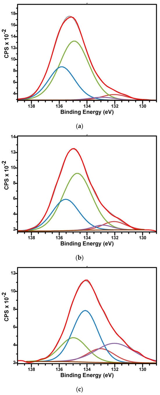 The high-resolution XPS spectra of P2p for samples are presented in Figure 8a–c. The spectra were fitted using two doublets, each covering peaks of P 2p3/2 and P 2p1/2 contribution, spaced by approximately 0.86 eV and with an area ratio of 0.5. The binding energies for P 2p3/2 signals were 132.04 and 134.7 eV for sample M; 132.03 and 134.8 eV for sample M_Al5; and 132.01 and 134.12 eV for sample M_Al10, respectively. The binding energies around 132 eV for P 2p3/2 signals were specific to orthophosphate PO43− units characteristics for hydroxyapatite while the binding energies around 134.5 eV were characteristics to the metaphosphate (P-O-P bonds) structure [64,66].
