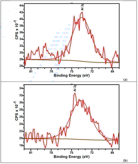 The high-resolution XPS spectra of Al2p for samples are presented in Figure 9a,b. The signals present a small shift to lower binding energy at the aluminium content increases in sample. For M_Al5, the Al2p peak is centred at 75.4 eV while for M_Al10 appears at 75 eV. These values are indicators for the presence of Al3+ bonds with Ca2+ (via oxygen atoms bridges), PO42− and/or PO43−.