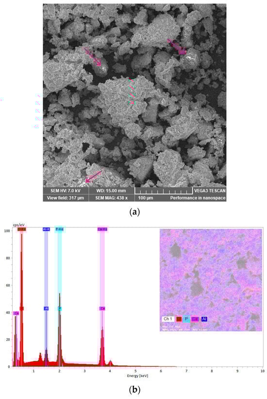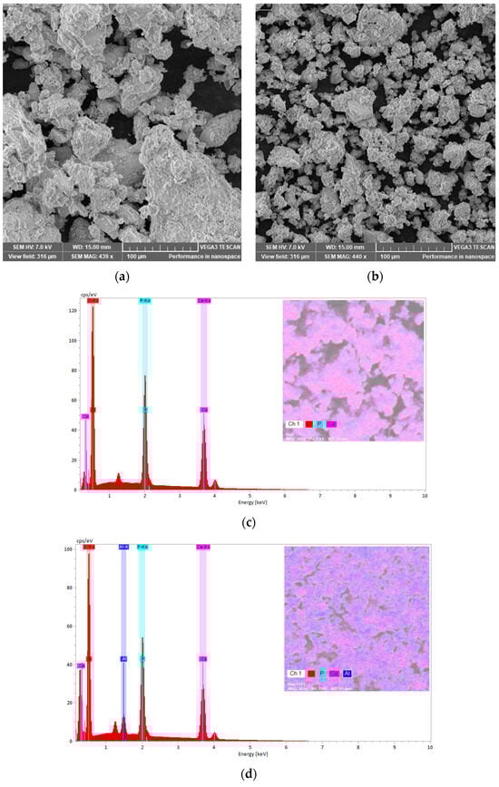 To follow the morphology and the aggregation tendency of the biphasic calcium phosphate sample with the aluminium additions, SEM images were taken (Figure 10a,b). Moreover, EDX spectra were recorded to check the samples composition (Figure 10c,d). The SEM images indicate the distribution of the constitutive atoms in agglomerates, which consist of smaller particles with a wide range size distribution for sample M. Increasing the Al content produces a marked reduction in particle size, consistent with an Al-driven rearrangement toward an HAp-dominated structure. XRD analysis corroborates this trend (Table 1). Raman spectra likewise indicate this evolution. The β-TCP ν1(PO4) band at 972 cm−1 is nearly extinguished upon Al addition, while the HAp ν1(PO4) band at 960 cm−1 becomes dominant. The energy-dispersive X-ray spectroscopy (EDX) confirms the composition, detecting Ca and P consistent with calcium-phosphate phases together with Al. The EDX maps presented in pseudo-colour representation illustrate the elemental distribution across the sample surfaces. For sample M, the map reveals a relatively homogeneous dispersion of Ca and phosphorus P with localized oxygen enrichments. In contrast, the map for the M_Al10 sample indicates a uniform distribution of Al on the surface, with observable agglomeration of calcium and phosphorus. These observations corroborate the findings obtained through the Rietveld refinement analysis.