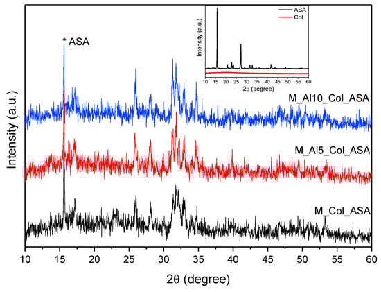XRD patterns of the composites. The reference spectra for collagen (Col) and acetylsalicylic acid (ASA) are shown in the inset.