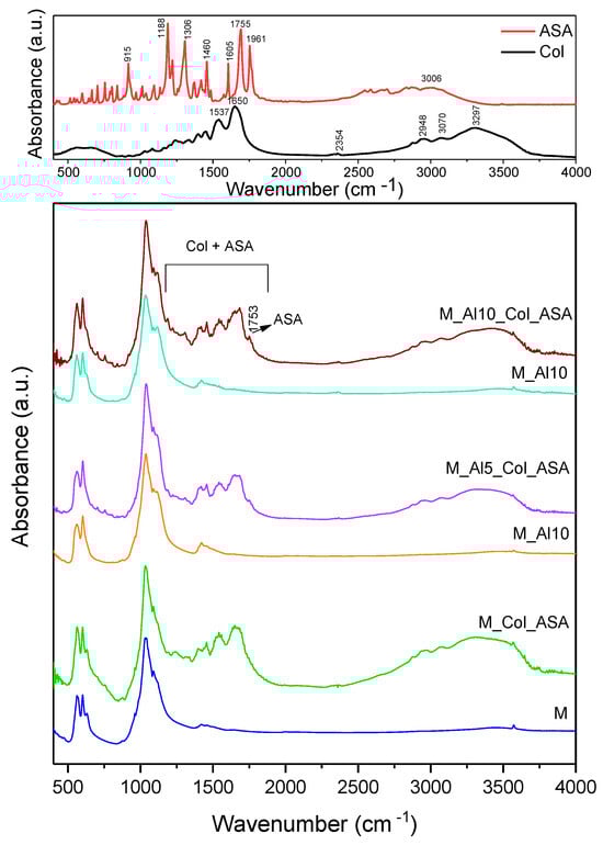 Comparative FTIR spectra of as-prepared samples and composites. The reference spectra for collagen (Col) and acetylsalicylic acid (ASA) are shown in the top.