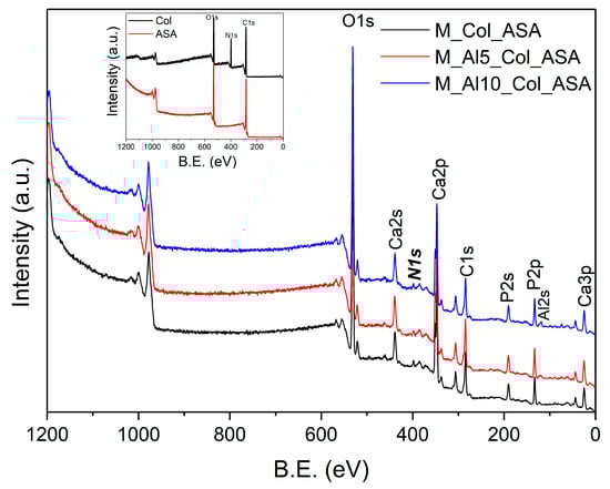 The XPS survey spectra of the composites. The reference spectra for collagen (Col) and acetylsalicylic acid (ASA) are shown in the inset.