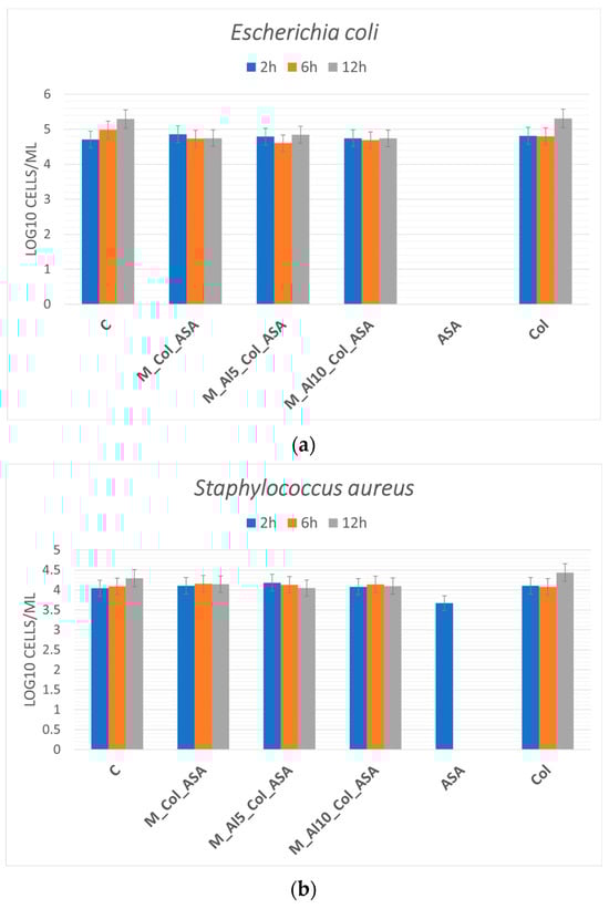 The in vitro antibacterial response of the composites was assessed against Escherichia coli (ATCC 25922) and Staphylococcus aureus (ATCC 1109R). CFUs were quantified at 2, 6, and 12 h, and results are shown as mean ± standard error (n = 3) in Figure 16a,b. In bone-regenerative biomaterials, acetylsalicylic acid (ASA) can act as a bioactive additive that—via cyclo-oxygenase (COX) inhibition and consequent prostaglandin E2 suppression—attenuates inflammation, modulates osteoblast–osteoclast activity, and may provide adjunct antibacterial/biofilm-modulating effects under controlled release [5,32,33,34,35,74]. Within the present variability, the small decreases observed for E. coli at 6–12 h did not exceed the associated standard errors and are therefore interpreted as non-significant trends. For S. aureus, CFU values were consistently lower than the negative control across time points, indicating a time-dependent bacteriostatic tendency; however, these differences likewise did not reach statistical significance under the current sampling. Notably, even modest bacteriostatic effects are relevant for implantable biomaterials because they curb early bacterial proliferation, allowing the host immune system (and adjunct antibiotics, if used) to clear the residual burden. Accordingly, under the tested conditions the composites exhibit modest, time-dependent bacteriostatic behavior consistent with ASA’s strain- and dose-dependent adjunct activity; larger sample sizes, optimized ASA loading/release, and formal hypothesis testing are warranted to resolve statistical differences.