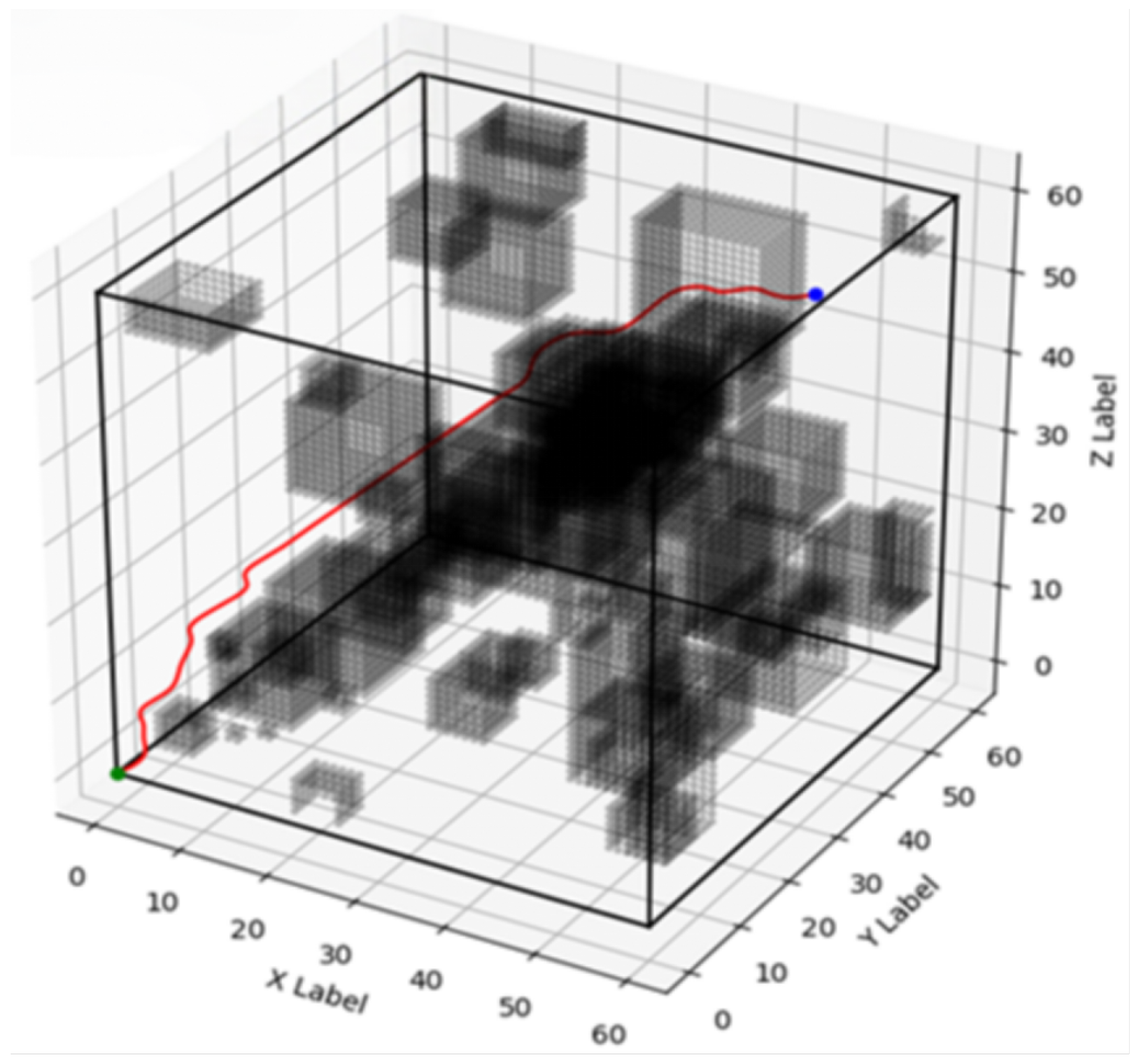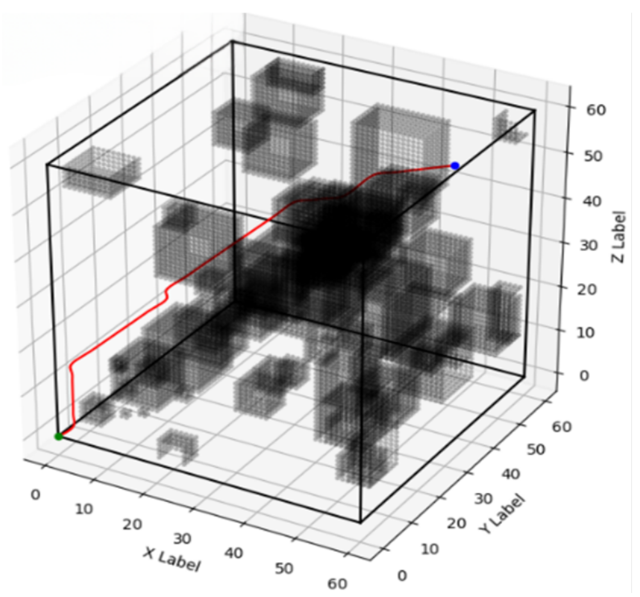 With this improvement, our A* algorithm is able to perform a more flexible and efficient path search in 3D space. The improved motion model not only improves the accuracy of path planning [16], but also significantly improves the performance of the algorithm in dealing with complex 3D environments. This improved method provides an effective solution for 3D path planning, which has important theoretical and practical application value.