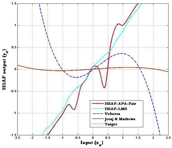 The adapted nonlinearity of the proposed HSAF–APA–Fair model compared with the traditional HSAF-LMS [4], Volterra [21] and Jeraj & Mathews [22] is shown in Figure 2. It can be clearly seen that the averaged results of adapted nonlinearity for Volterra [21] and Jeraj and Mathews [22] do not overlap with the nonlinear memoryless target when the traditional HSAF-LMS scheme is non-adjustable while updating at 7000 samples over 100 trials. Note that the result of the proposed HSAF–APA–Fair obtained by a spline interpolation function employed in adaptive control points overlies the target in order to correspond with other nonlinear algorithms.