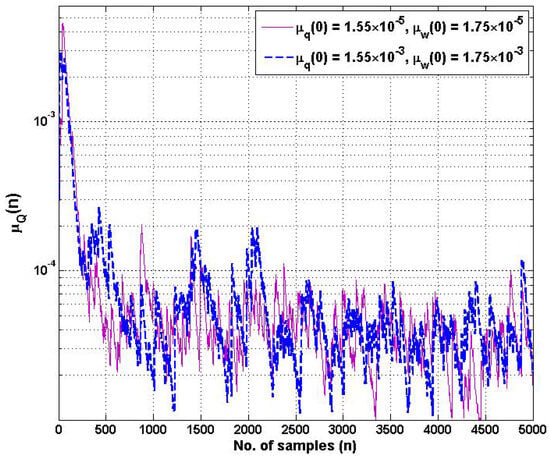 In addition, the learning rates of and are the crucial hyperparameters for controlling the coefficients and of the proposed HSAF–APA–Fair model with respect to the estimated error during updating. Figure 4 shows the learning rate of of adaptive control points , with the different initial values of . Figure 5 shows the learning rate of of the adaptive coefficient with the different initial values of . The proposed learning rate models of step-size parameters and begin to display slight fluctuations in learning while processing after several hundreds of samples. However, both adaptive step-size models still maintain a reasonable convergence rate of MSE performance. It is noticed that the learning rate of both and can converge effectively to a steady-state environment, starting with the 1000-fold change in different initial values of each step-size.