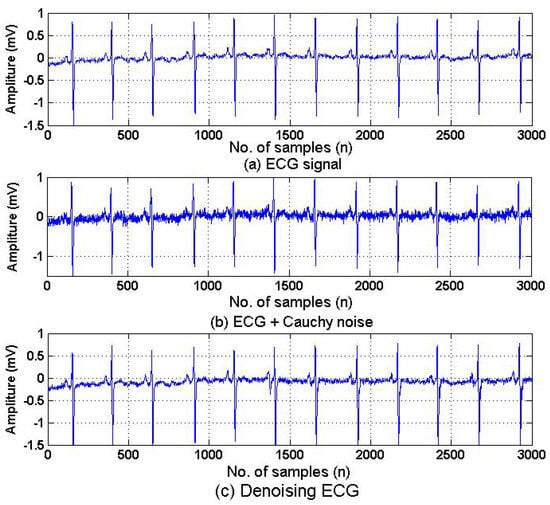 Figure 6 shows the comparison between original ECG, the ECG corrupted by Gaussian Cauchy noise, and the ECG signal denoised by proposed HSAF–APA–Fair model. It can be observed that the corrupted ECG signal in Figure 6b was disturbed by Cauchy random noise. The denoised ECG signal in Figure 6c is very similar to the original ECG shown in Figure 6a after filtering using the proposed HSAF–APA–Fair method in order to eliminate the Cauchy undesired noise.