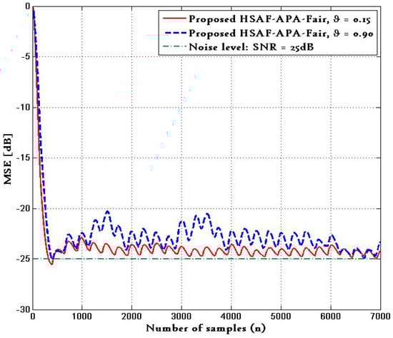 Figure 3 shows the performance of different approaches in terms of the MSE calculated by (41), where MSE curves were obtained from a test of 7000 samples with 100 trials. The comparison of MSE with is provided and shows the MSE curves of the proposed HSAF–APA–Fair model and HSAF-LMS [4] model with based on (40). It is clear that the MSE curves of the proposed HSAF–APA–Fair algorithm provides slower convergence compared to the traditional HSAF-LMS algorithm at steady state, while reaching the value of noise level.