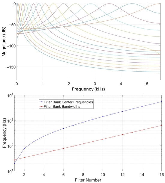 Cochlear filtering is an important part of human hearing, taking place in the inner ear. Gammatone filters have been implemented as a computational model for human cochlear filtering [25]. A gammatone filterbank consists of filters regularly spaced on the equivalent rectangular bandwidth as their center frequencies are distributed in proportion to their bandwidth. Figure 2 illustrates a filterbank of 16 filters based on a sampling frequency of 11,025 Hz, showing their frequency responses, center frequencies, and bandwidths. Acoustic features relying on gammatone filtering have been previously used in different works addressing human speaker recognition [26,27,28] and sound source localization [20].