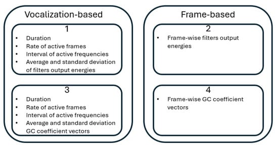 - Feature Extraction: Several features are extracted, including time–frequency information, designed to highlight distinguishing vocal characteristics across species, along with cochlear filtering-based features. These features aim to emulate auditory perception more closely than traditional acoustic features.