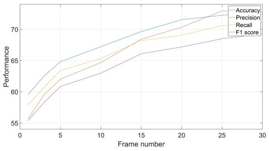Effect of frame number on classification performances: accuracy, precision, recall and F1-score.