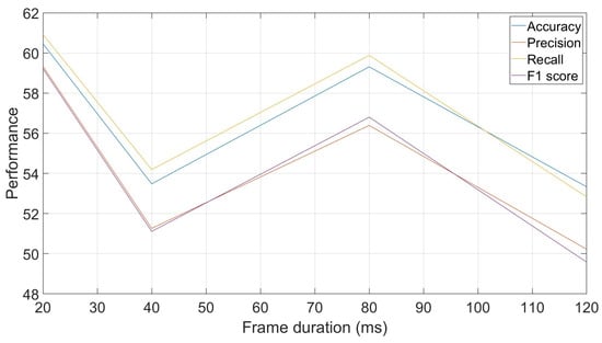Effect of frame duration on classification performances: accuracy, precision, recall and F1-score.
