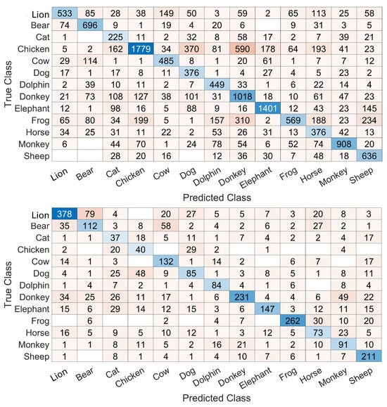 Confusion matrices obtained with the 20 ms and 80 ms durations are shown in Figure 7. As expected, the number of frames is higher with 20 ms frames. But another result, which is less intuitive, is the inter-class variability of performances due to the change in frame durations. For example, for the classs frog and chicken, the recognition rates evolve from 30.48% and 50.51% to 76.83% and 40,82%, respectively, when frame durations evolve from 20 ms to 80 ms, respectively. Additionally, the patterns of confusions are different for certain classes with different frame durations. This can be seen in the classes sheep, lion, and bear, for example. These indications could result in concluding with a frame duration that can fit one class more than other classes, or more than other frame durations. Such a fact can be exploited to improve the performances.
