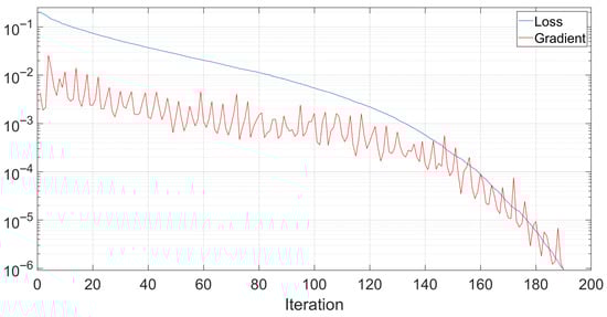 Throughout the performed tests, the training data of the neural network was observed to investigate its speed and effectiveness. Figure 8 shows the evolution of the training loss with respect to the training iteration number. As shown, the training stopped after 190 iterations. In the shown example, the training lasted for around 2.2 s on a PC running Microsoft Windows 11 on an Intel Core i7-12650 processor with 32 GB of RAM and an NVIDIA GeForce RTX 4060 graphical processing unit.