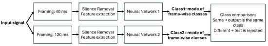 Based on the results obtained in the previous parts, a new architecture is proposed. This architecture relies on two neural networks trained with features extracted based on two different time frame durations. Figure 9 shows the architecture and depicts the classification decision, which is done when the two neural networks output the same class. It should be noted that each neural network decision is a unique class label based on the decisions of all the input frames, being the mode of the frame-by-frame decisions.