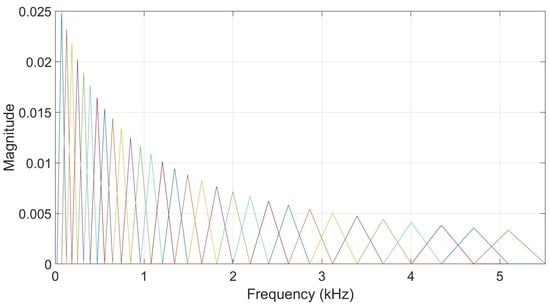 However, to compare the two types of filterbanks directly, a comparison has been done between the results based on a neural network trained with the output energies of the gammatone filterbank and another one trained with the output energies of a triangular filterbank like the one illustrated in Figure 10. This filterbank consists of filters regularly spaced on the mel-scale and with the same number of filters used in the gammatone filterbank as well as the same frequency interval. Two tests were performed with the same samples that were used in both filtering approaches to ensure that that comparison is done in the same conditions. The frame duration used was 20 ms. The results are reported in Table 9. These results suggest that both filterbanks are capable of producing competitive outcomes, depending on the characteristics of the data and the experimental setup. Nevertheless, the gammatone filterbank offers an additional advantage in its biomimetic design, as it more accurately models the auditory filtering process of the human cochlea. This physiological grounding provides a stronger conceptual foundation and may lead to better generalization across diverse animal vocalization datasets and acoustic environments.