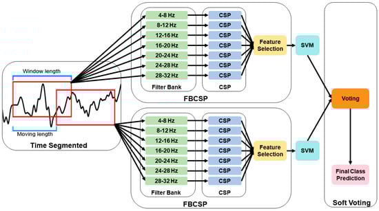 FBCSP-TS was applied to search for the time segmentation with optimized performance, and through this, temporal features were additionally accumulated (Figure 2). Data segmentation was applied to improve the robustness of feature extraction at low sampling frequencies. The researchers identified transient temporal features by applying the FBCSP method across multiple overlapping time segments. Specifically, the researchers tested a comprehensive combination of window lengths (0.5–4.0 s) and moving steps (0.5–4.0 s), yielding 64 distinct temporal configurations. The window length represents the temporal interval for feature extraction, whereas the moving length defines the temporal displacement between consecutive analysis windows. Classification performance was evaluated across all combinations to identify the optimal temporal segments for MI and visualized using a heatmap. This parametric design allowed the model to capture optimal temporal segments for classification. Notably, the use of overlapping temporal segments (i.e., shorter moving steps than window lengths) has been shown to enhance signal-to-noise ratio (SNR) and subsequently improve classification performance [33,34]. A soft voting method was applied to address the dimensional mismatch between the segmented data and the original data. The final class was determined by averaging the predicted probabilities of each time segment, thereby producing consistent classification results that reflected the information of all segments.