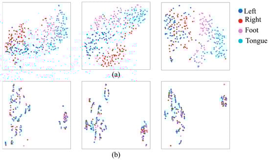 Figure 3 shows the data of the original frequency of 250 Hz and the lowest frequency of 10 Hz, which were represented in a 2D space using the t-distributed stochastic neighbor embedding (t-SNE) [42] technique to analyze the effect of the sampling frequency of EEG signals on the classification performance. Blue, red, pink, and cyan dots represent the left hand, right hand, foot, and tongue, respectively. At 250 Hz, it can be seen that the four classes (left hand, right hand, foot, and tongue) are separated. On the other hand, at 10 Hz, it can be seen that all classes are distributed in a disorderly manner, and the possibility of discrimination between classes is lowered. The results show that class classification is better with higher sampling frequencies, and lower sampling frequencies adversely affect class classification.