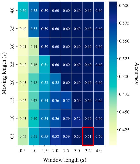 Figure 4 shows the heatmap visualization of the classification performance according to the time division parameters to distinguish MI using BCI Competition IV Dataset 2a. The matrix shows the maximum accumulation value achieved by the machine learning model, the column is the window length, and the row is the moving length. In the phase triangular matrix section where the sum of the window length and the travel length exceeds 4 s, the signal cannot be further divided, so only the same data of the first window length is used to show the same performance. The red rectangle shows the optimal time interval for each classification task. A maximum performance of 0.61 was achieved when using the SVM classifier in a window length of 3.5 s and a moving length of 0.5 s.