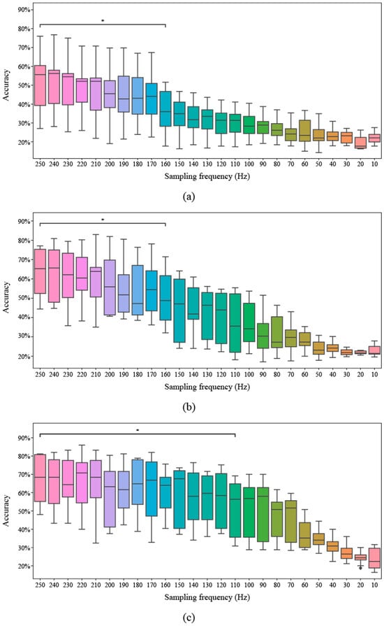 Classification accuracy across different sampling frequencies for three methods. The asterisk (*) indicates a p-value lower than 0.05. (a) Common spatial pattern (CSP), (b) Filter bank common spatial pattern (FBCSP), (c) Filter bank common spatial pattern with time segmentation (FBCSP-TS).