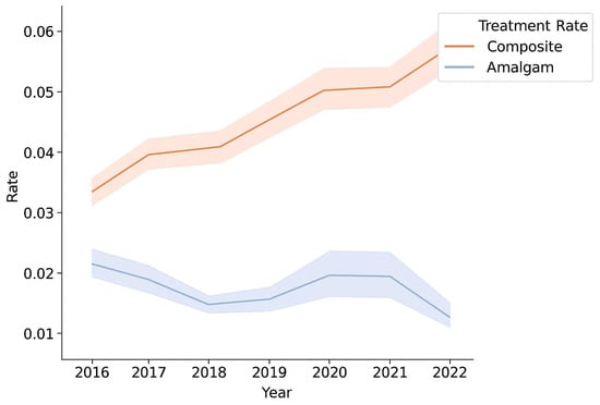Comparison between the amalgam treatment rate and the composite treatment rate for each year 2016–2022.