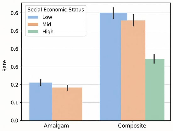 Stratification by socio-economic status showed that composite resin had largely supplanted dental amalgam as the preferred material across all SES categories (Figure 3). Children from low-SES backgrounds had the highest overall rates of restorative treatments (for both amalgam and composite), but the proportionate shift toward composite was evident in low, medium, and high SES groups alike (p < 0.05).