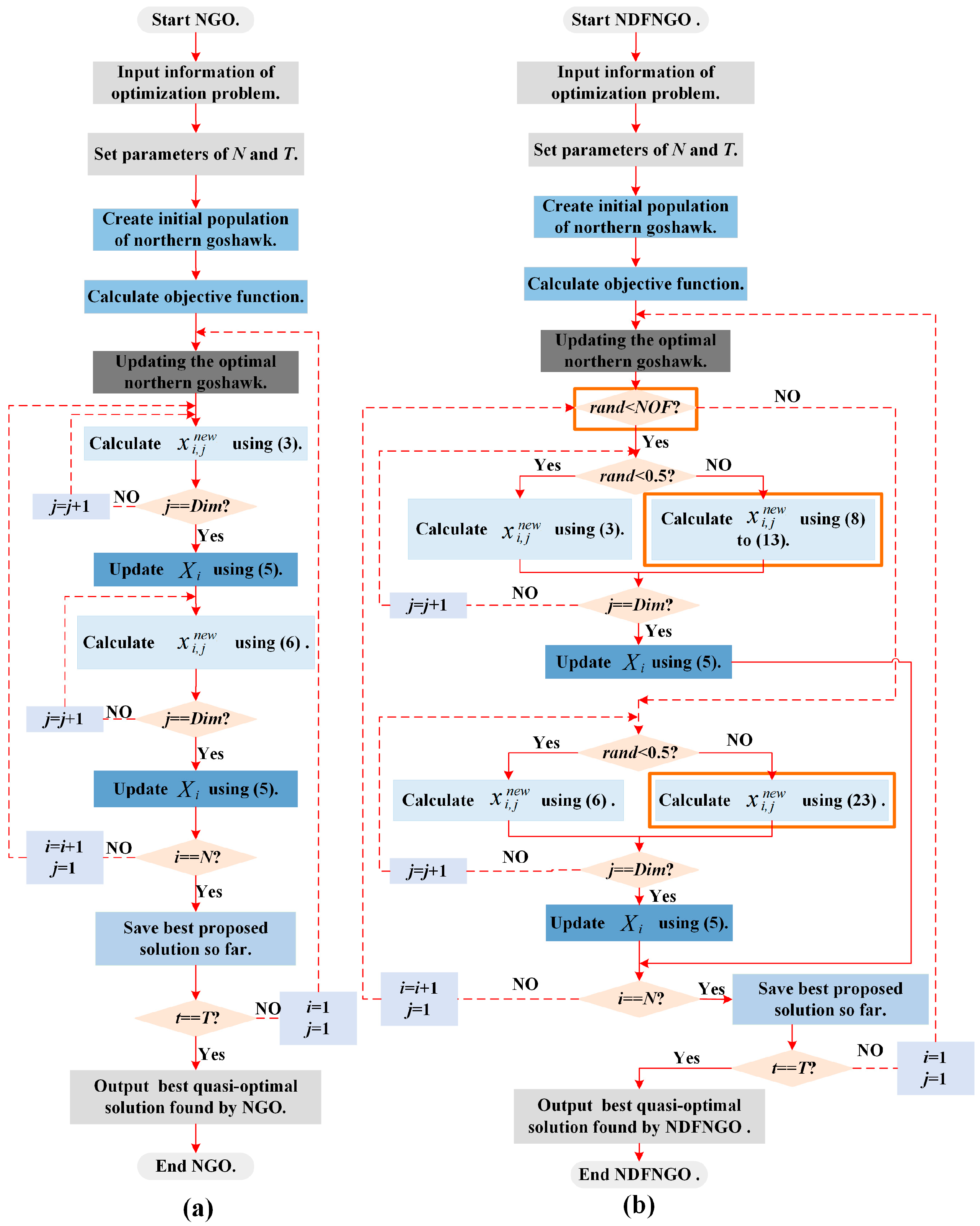 - By integrating the aforementioned three improvement strategies into the NGO algorithm, the NDFNGO algorithm is proposed.