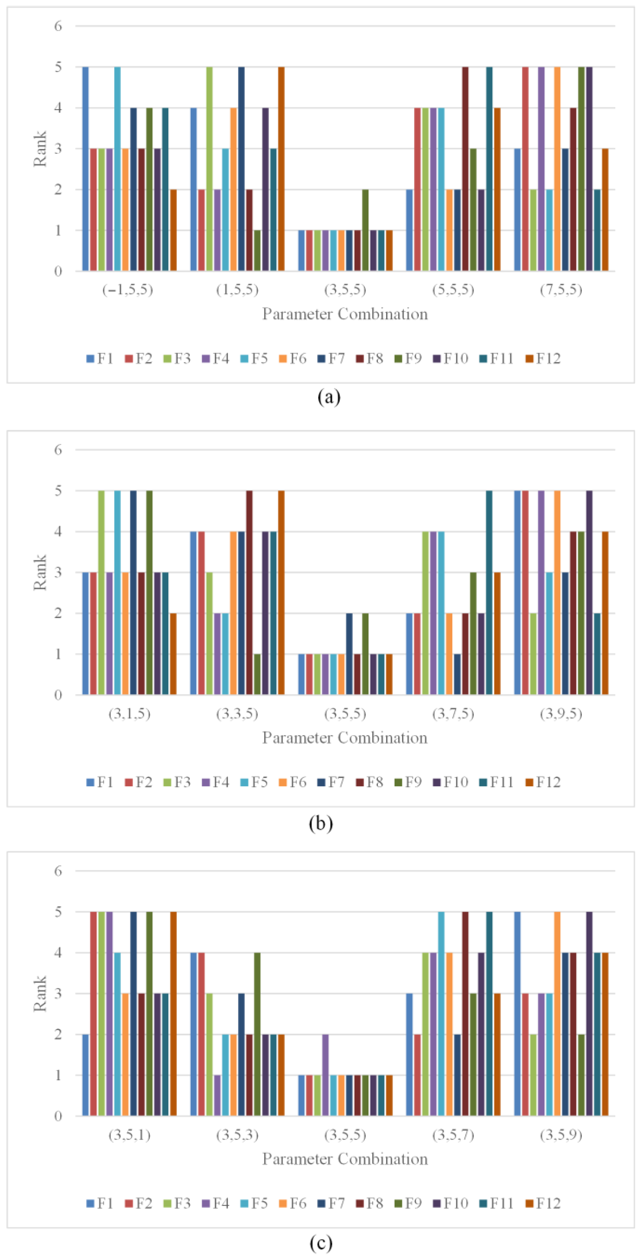 | F12 | 2 | 1.796 × 10−05/− | 9.273 × 10−10/− | 8.507 × 10−07/− | 5.327 × 10−04/− | 7.199 × 10−05/− |