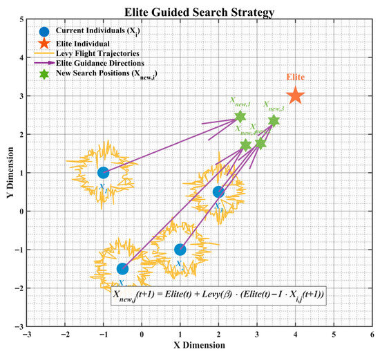 As illustrated in Figure 1, this strategy effectively avoids the over-attraction to a single best solution through multiple guiding targets. The heavy-tailed property of Lévy flights enables large jumps in the early stages to enhance global exploration, while fine guidance by elite individuals improves local exploitation in later stages, significantly boosting the algorithm’s optimization performance in complex multimodal functions.