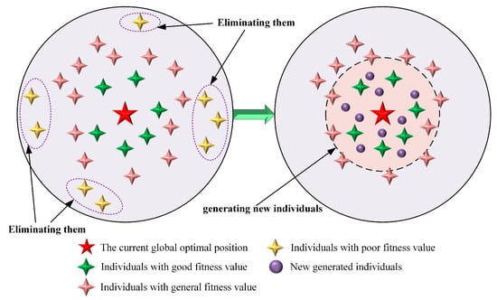 where is a decay factor that gradually decreases over iterations to control the distance of new solutions from the global best, is a random vector of dimension , and and are the upper and lower bounds of the search space, respectively. This mechanism ensures that the newly generated individuals explore the vicinity of the global best solution while progressively narrowing the search range over iterations, balancing exploration and convergence. A schematic of the precise elimination and generation mechanism is shown in Figure 3.