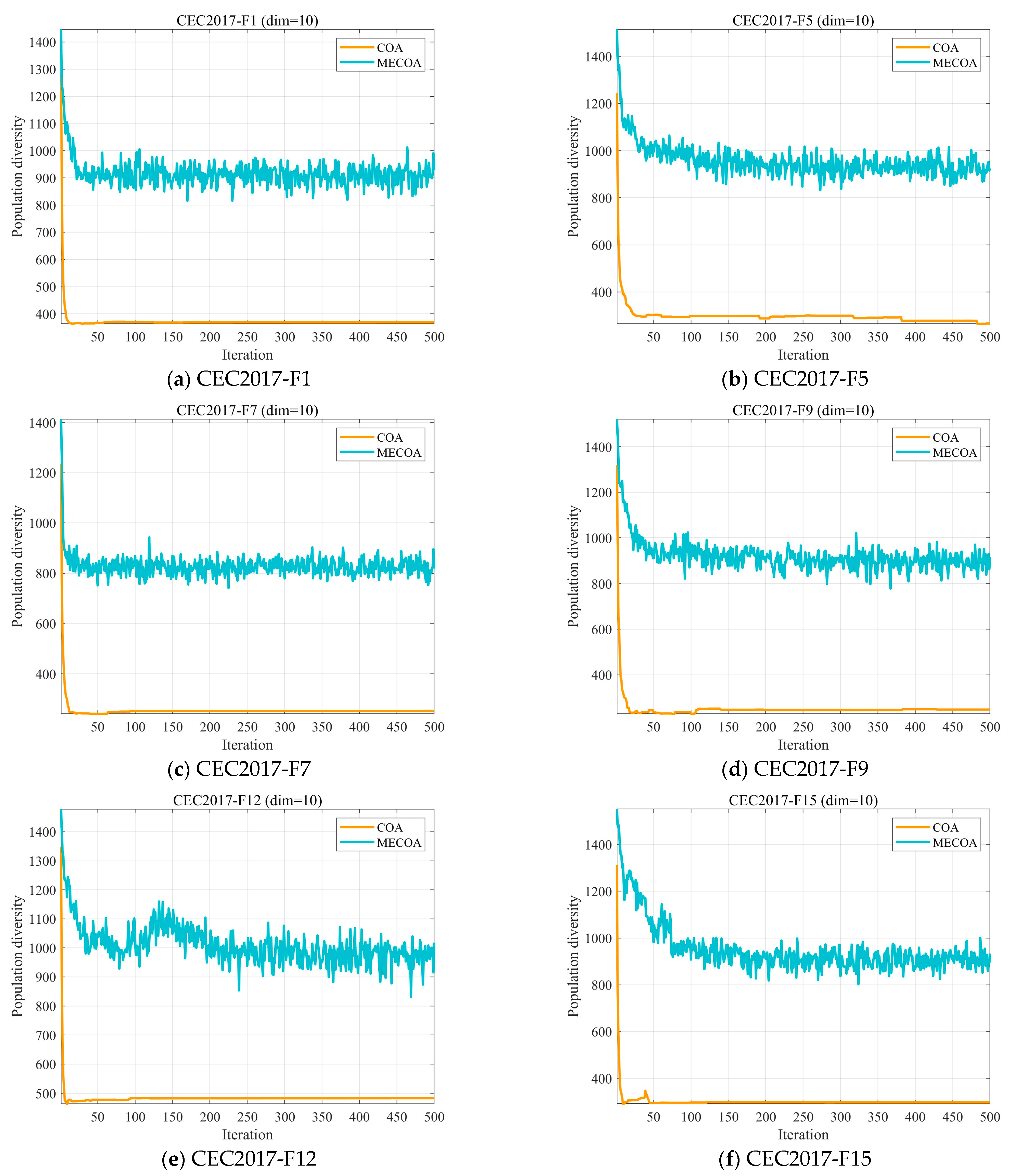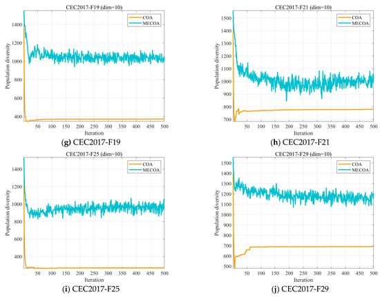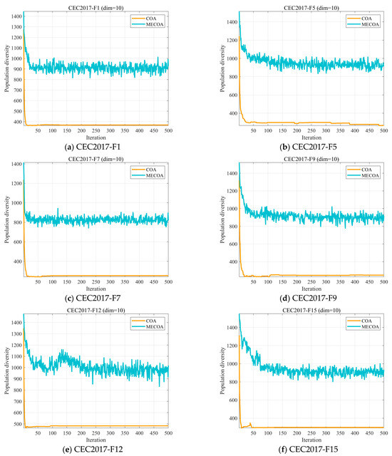 In optimization algorithms, population diversity describes the degree of variation among individuals in a population [31,45], where each individual typically corresponds to a candidate solution. A decline in population diversity can lead to premature convergence to a local optimum, thereby constraining the algorithm’s global search capability. On the other hand, preserving higher diversity facilitates exploration across broader areas of the solution space and improves the probability of locating the global optimum. In this subsection, we evaluate the population diversity of the MECOA based on Equation (14) [46,47]