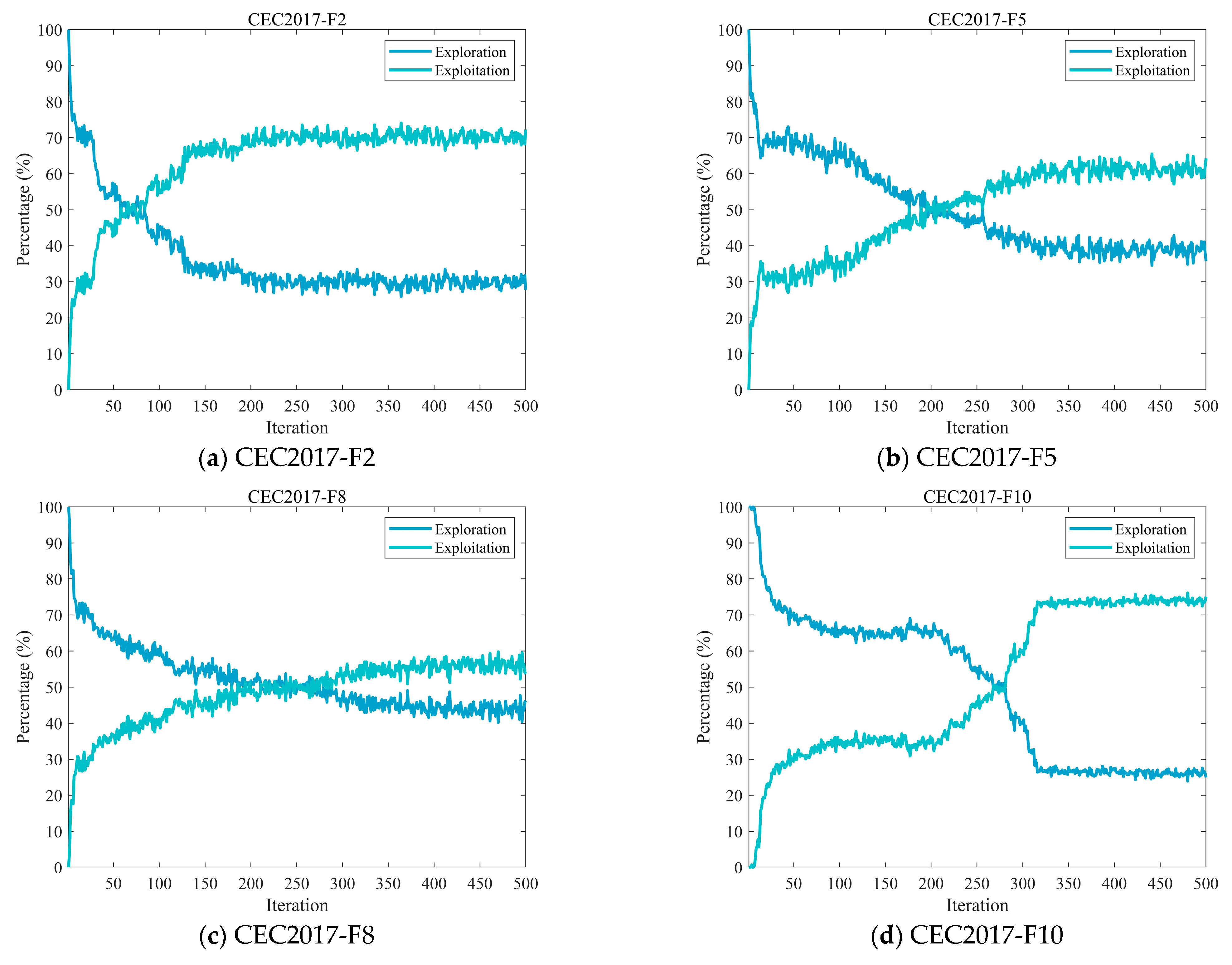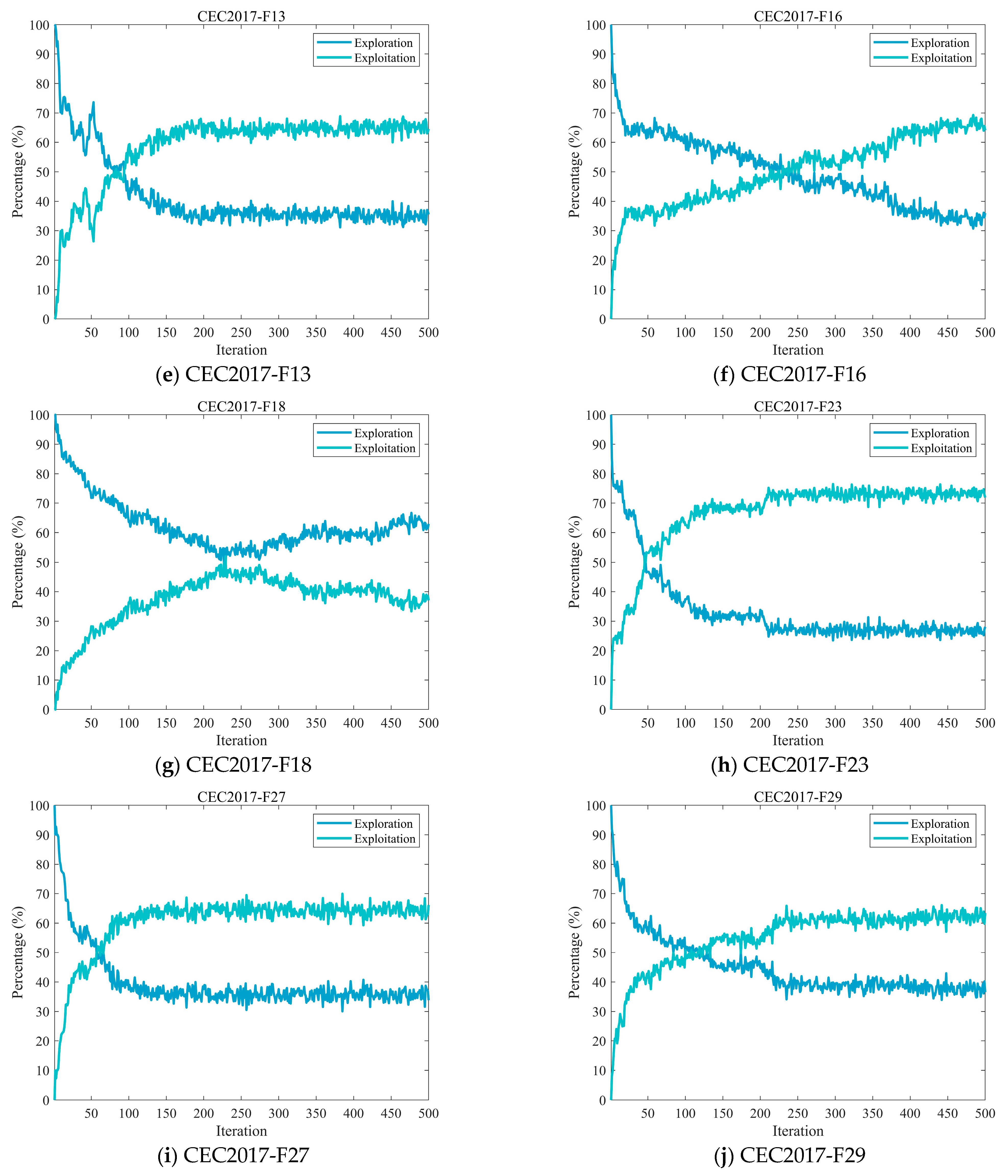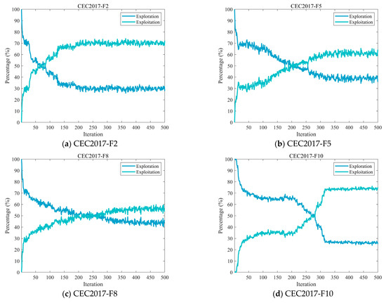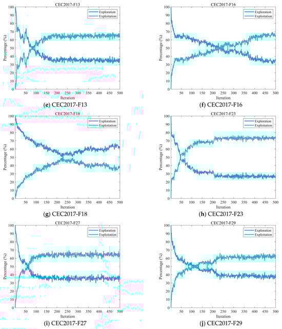 Excessive exploration may lead to inefficient use of computational resources by scanning the solution space broadly without focused improvement, thereby overlooking opportunities to enhance solutions in specific regions. On the other hand, over-emphasis on exploitation can result in premature convergence to a local optimum, hindering the algorithm’s ability to locate superior solutions in other parts of the search space [48,49]. Therefore, striking a balance between exploration and exploitation is critical to the overall effectiveness of the algorithm. In this subsection, we analyze the exploration and exploitation characteristics of the MECOA, which are quantitatively assessed using Equations (16) and (17) [47].