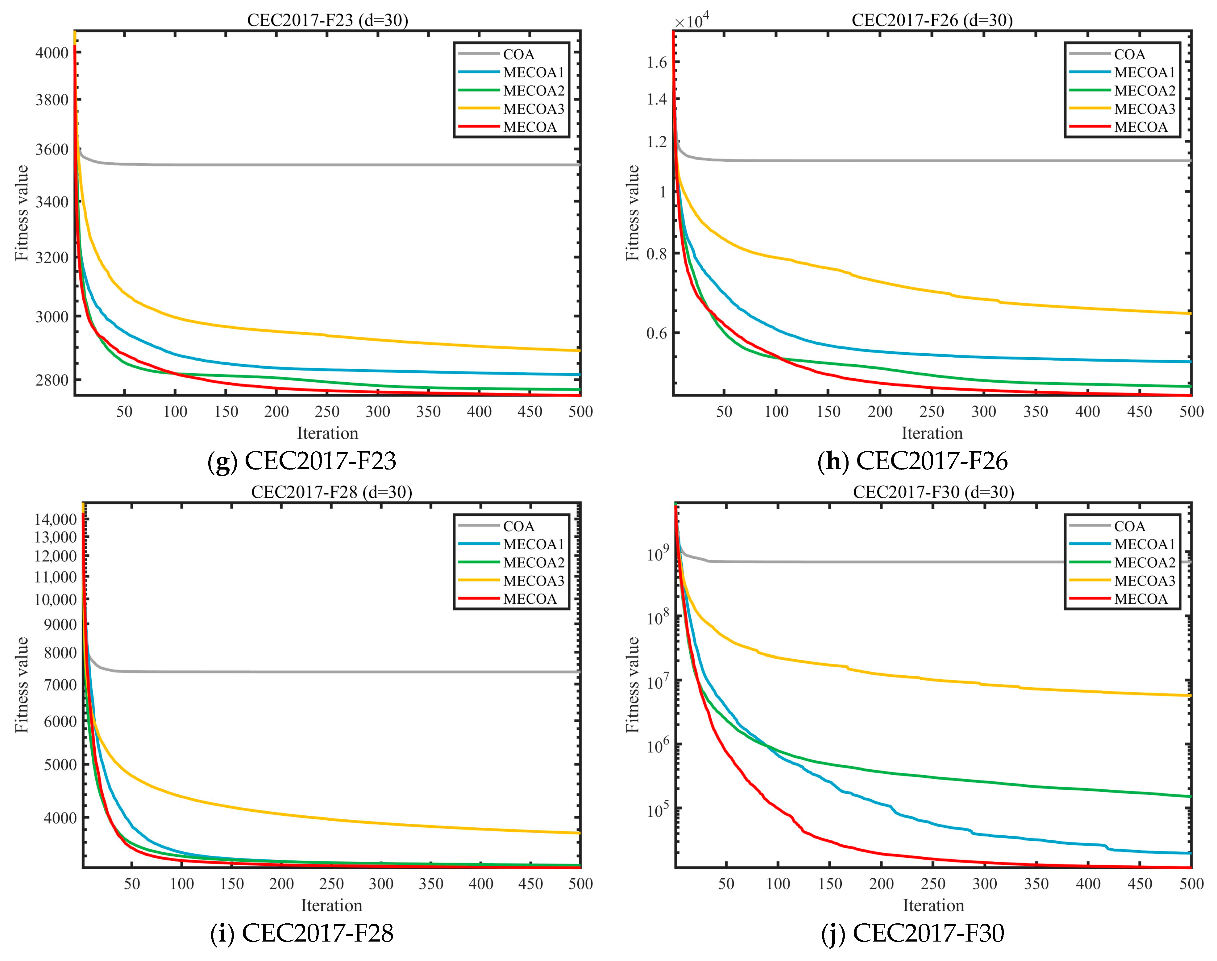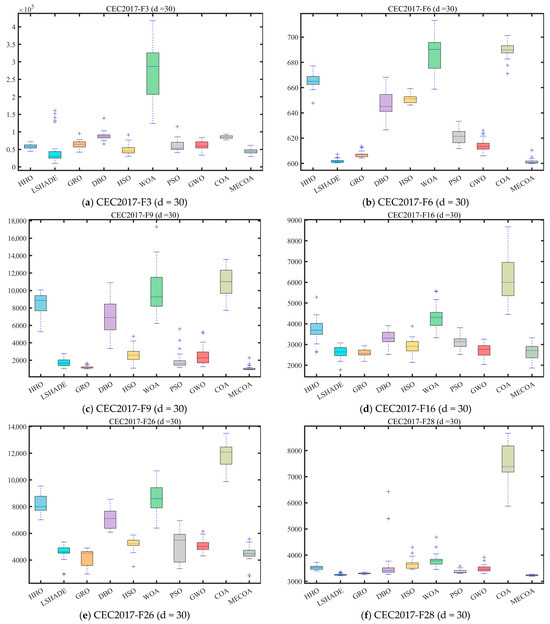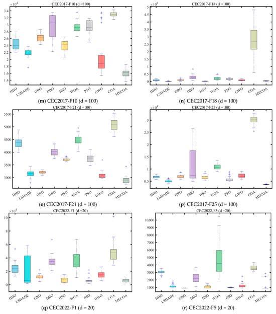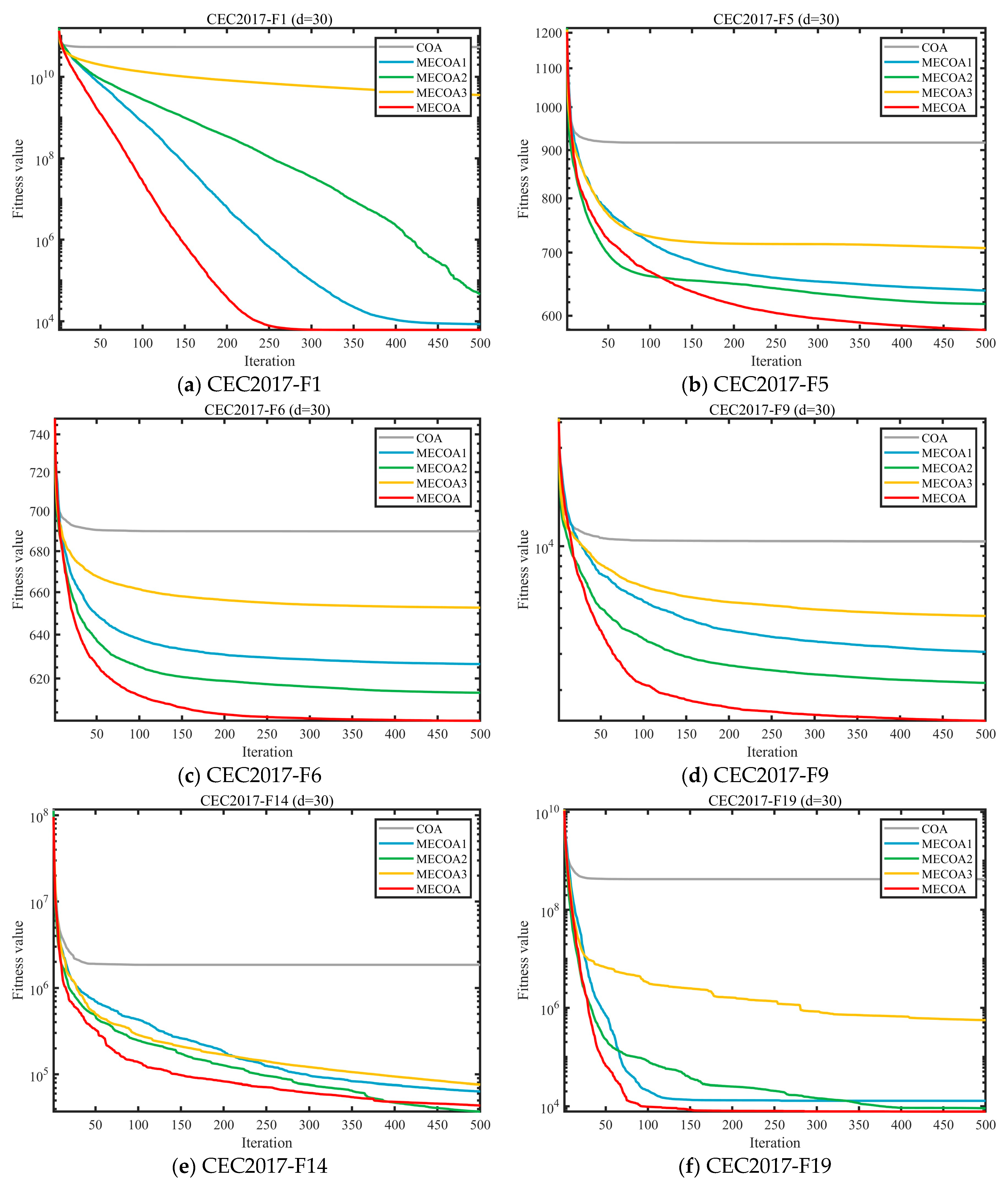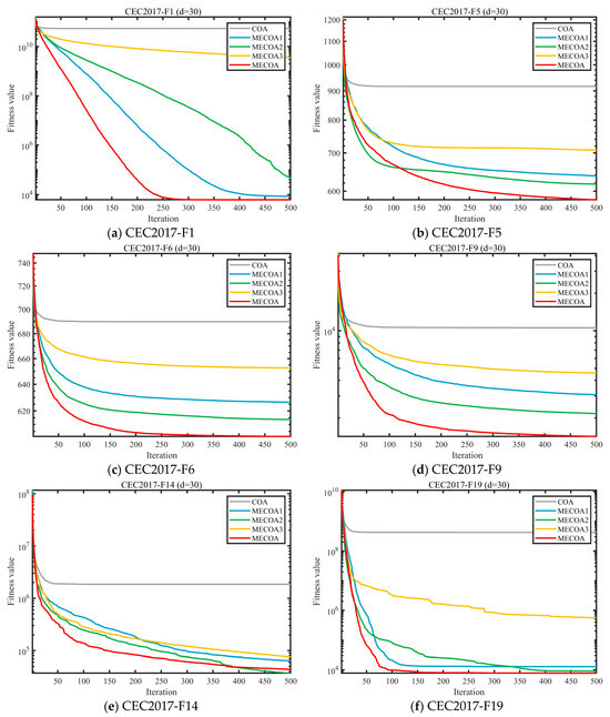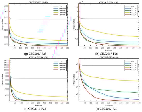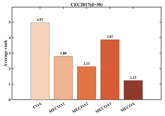 To evaluate the independent contributions and synergistic effects of the three enhanced strategies—Elite-Guided Search Strategy (S1), Horizontal Crossover Strategy (S2), and Precision Elimination Mechanism (S3)—an ablation study was conducted using the CEC 2017 benchmark with a problem dimension of d = 30. Four comparative variants were designed: MECOA1 (containing only S1), MECOA2 (containing only S2), MECOA3 (containing only S3), and the fully integrated MECOA incorporating all strategies. The experimental results are presented in Figure 6 and Figure 7.