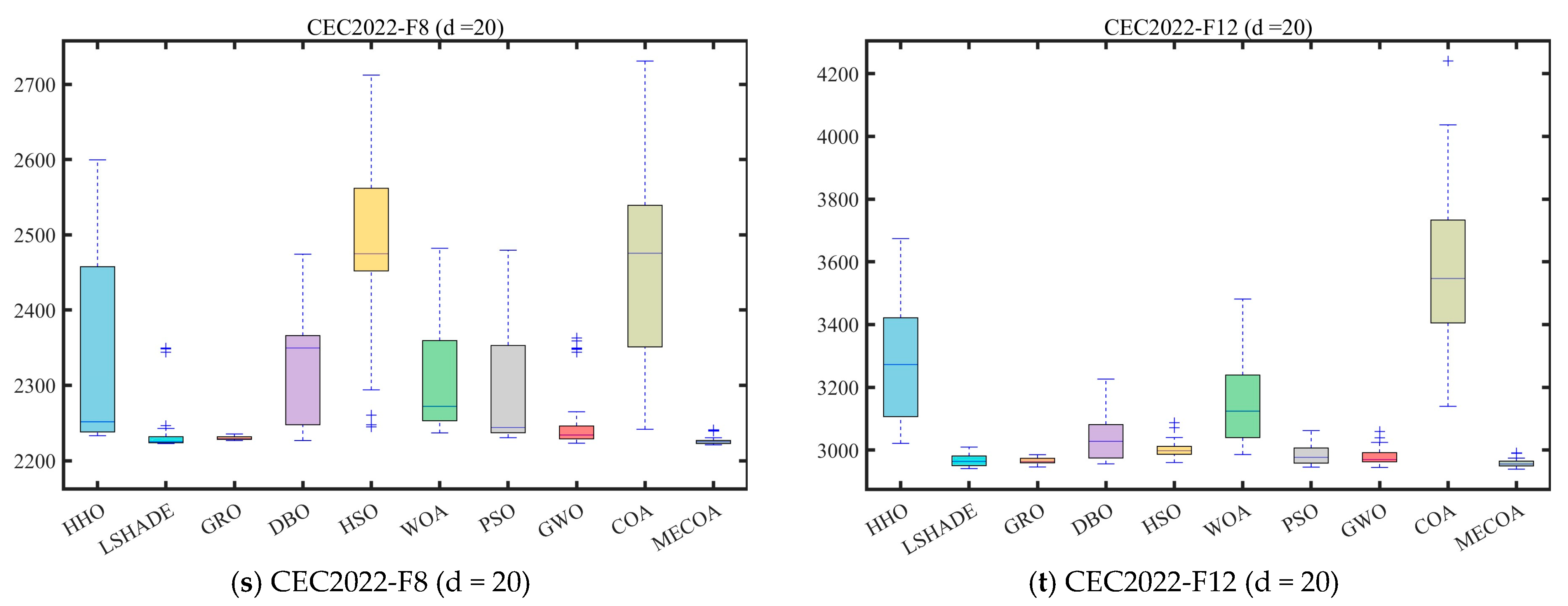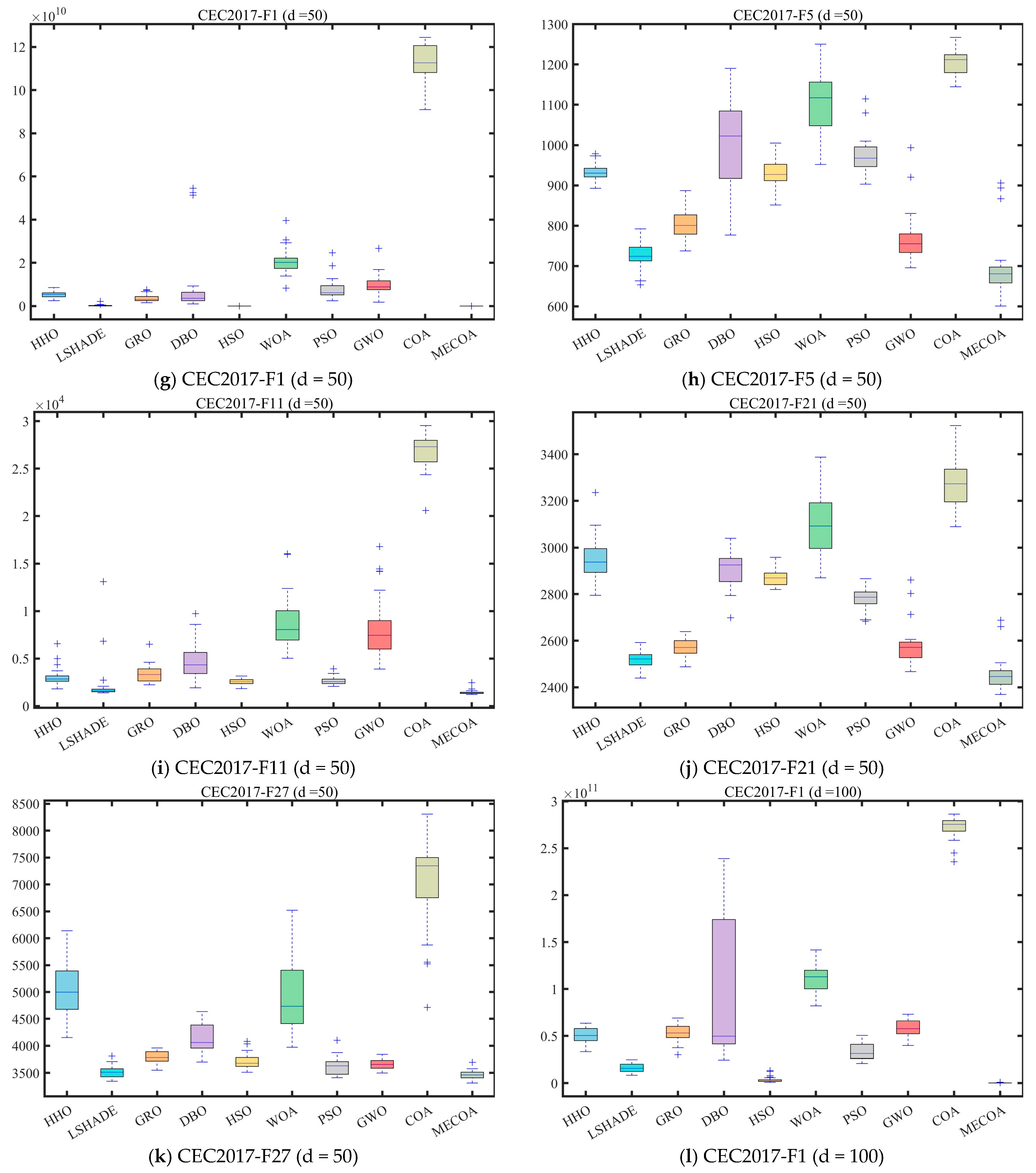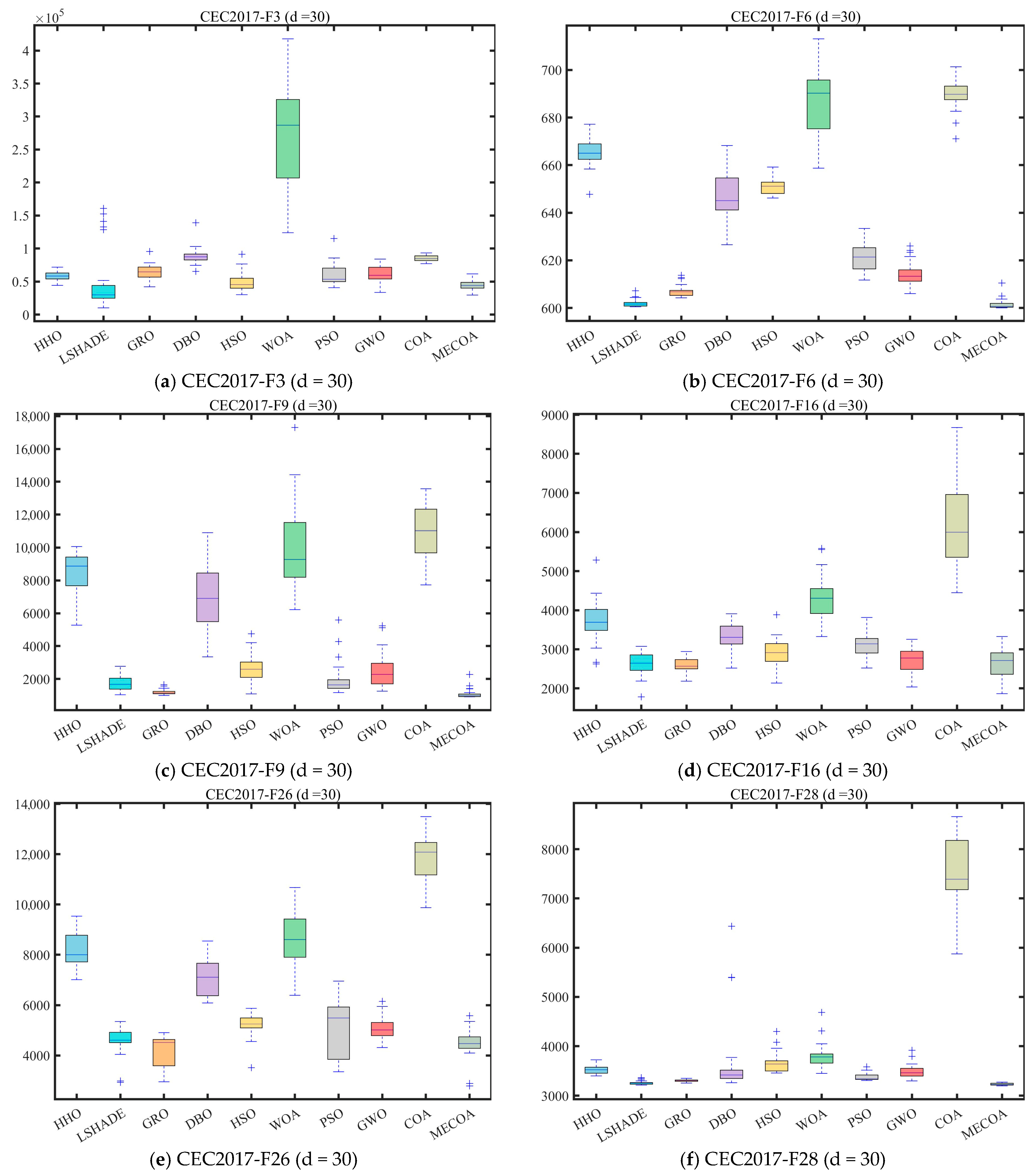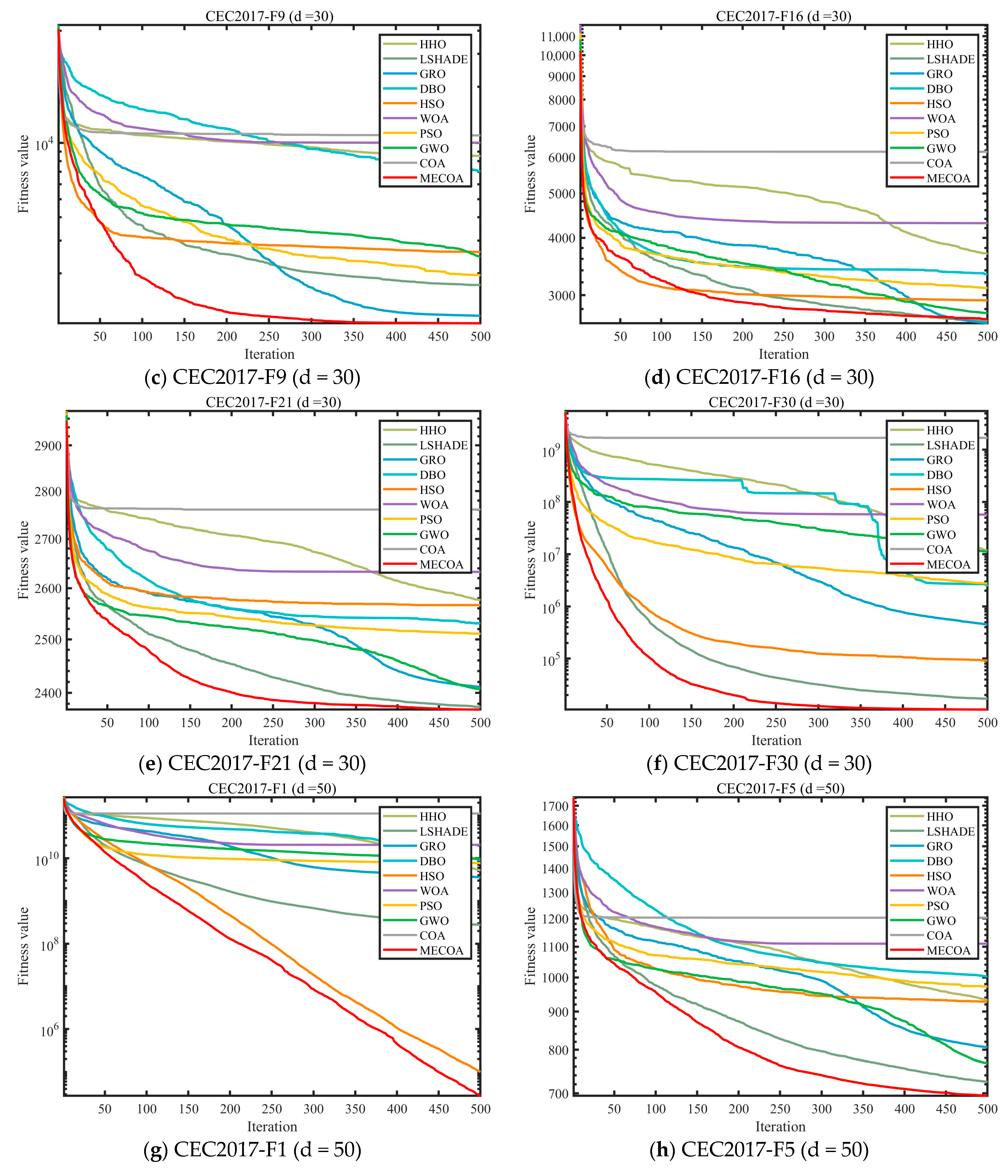 In this section, the superior performance of the proposed MECOA is validated through comparative experiments with eight state-of-the-art algorithms, including the Harris Hawks Optimization (HHO), Improving the search performance of SHADE using linear population size reduction (LSHADE), Gold Rush Optimizer (GRO), Grey Wolf Optimizer (GWO), Whale Optimization Algorithm (WOA), Particle Swarm Optimization (PSO), Holistic Swarm Optimization (HSO), Dung Beetle Optimizer (DBO), and the standard Coati Optimization Algorithm (COA).