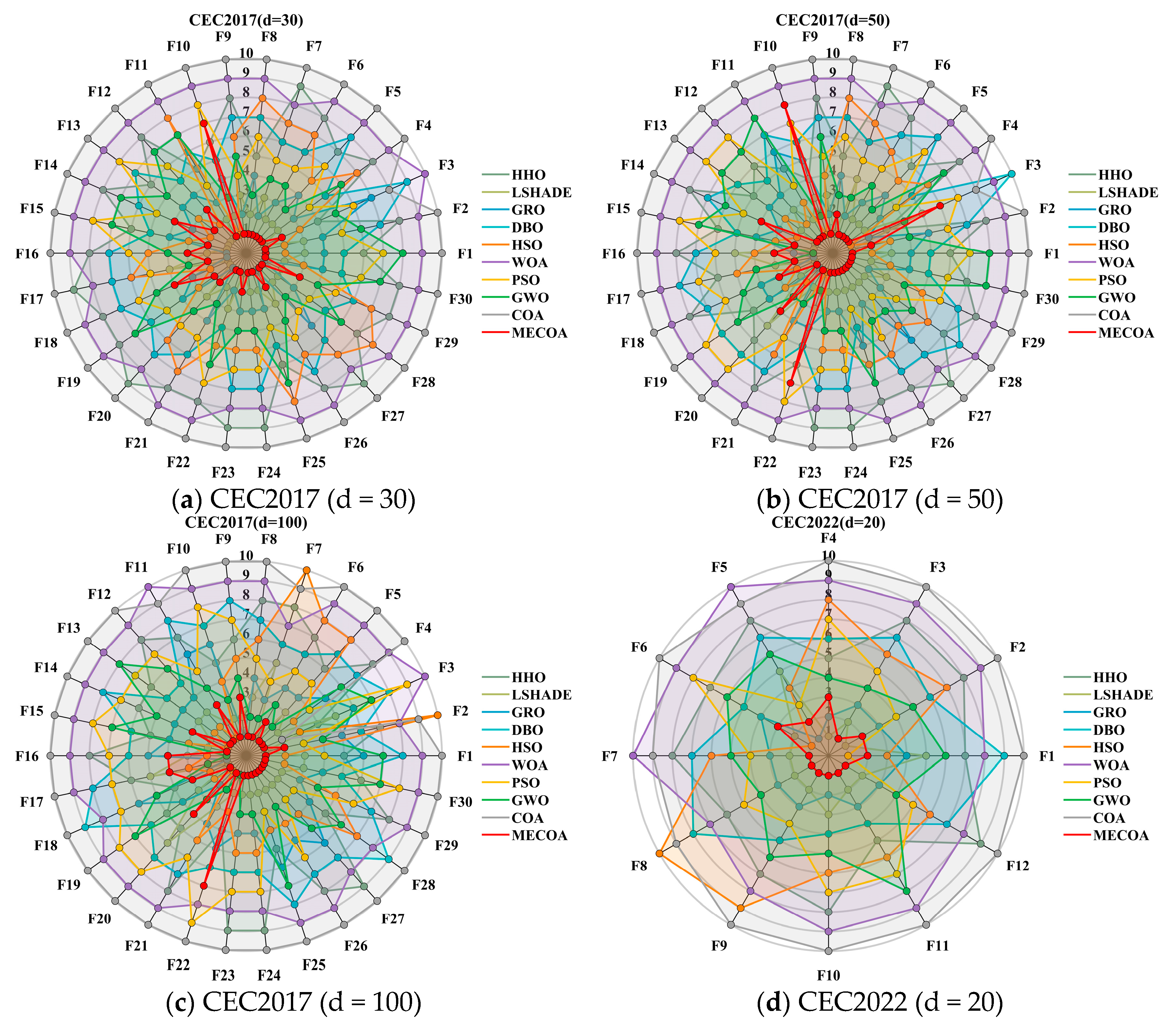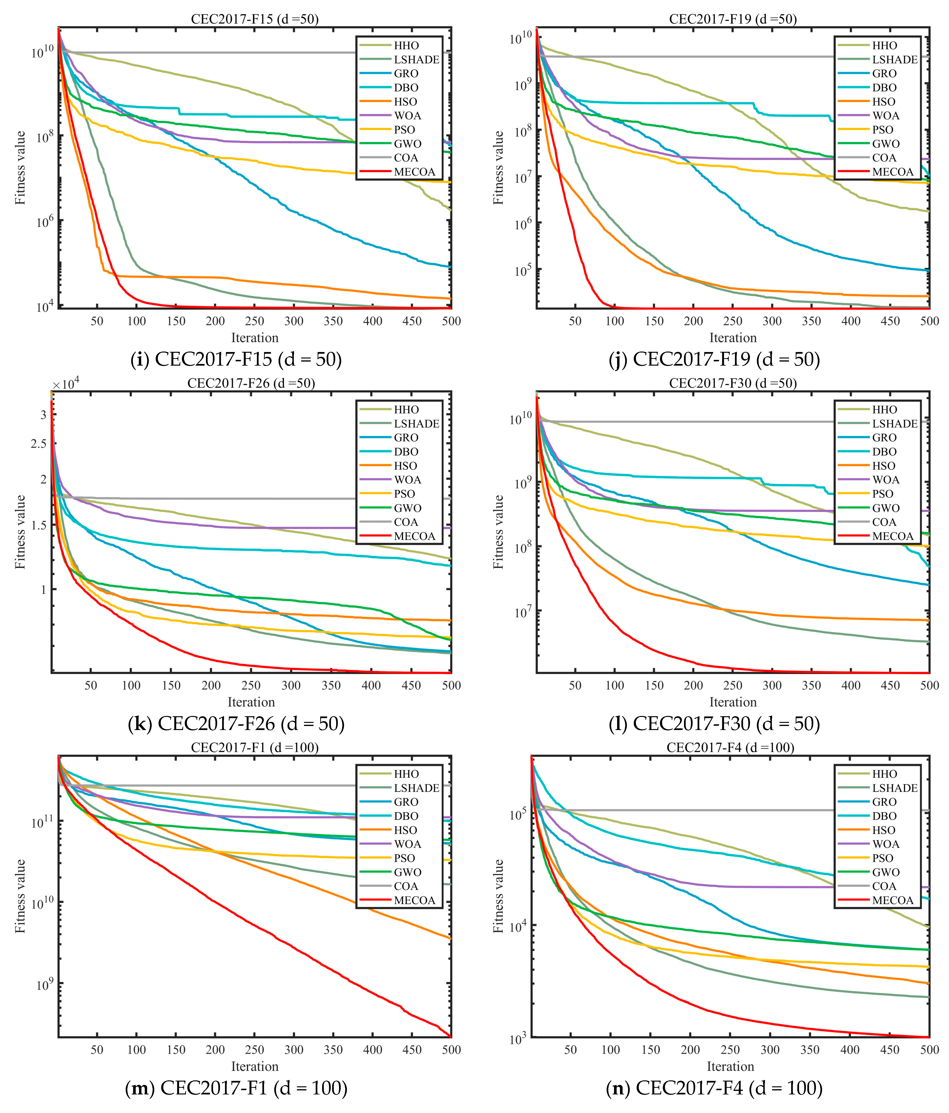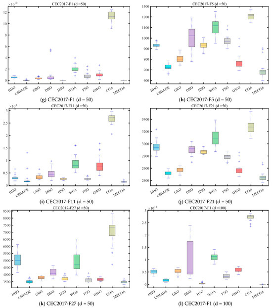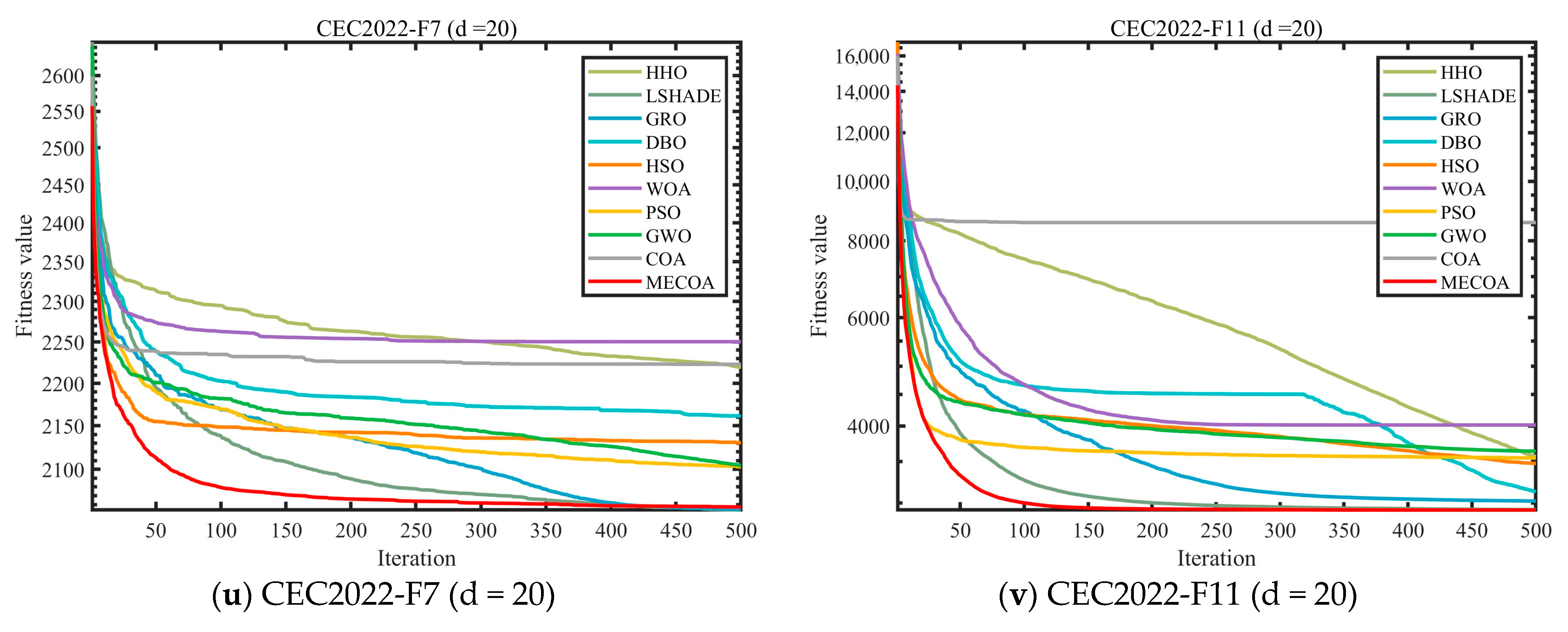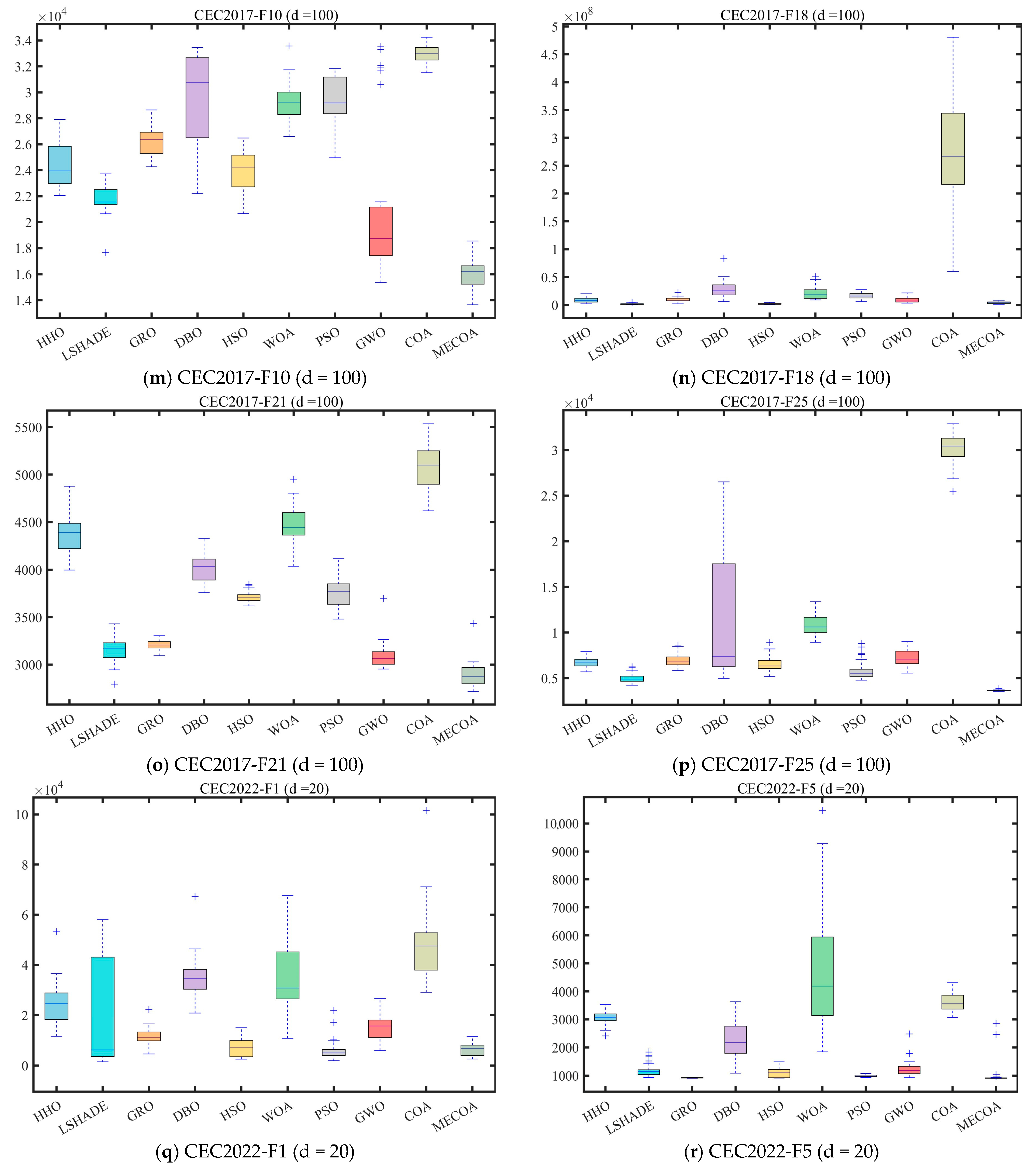 In this section, the superior performance of the proposed MECOA is validated through comparative experiments with eight state-of-the-art algorithms, including the Harris Hawks Optimization (HHO), Improving the search performance of SHADE using linear population size reduction (LSHADE), Gold Rush Optimizer (GRO), Grey Wolf Optimizer (GWO), Whale Optimization Algorithm (WOA), Particle Swarm Optimization (PSO), Holistic Swarm Optimization (HSO), Dung Beetle Optimizer (DBO), and the standard Coati Optimization Algorithm (COA).