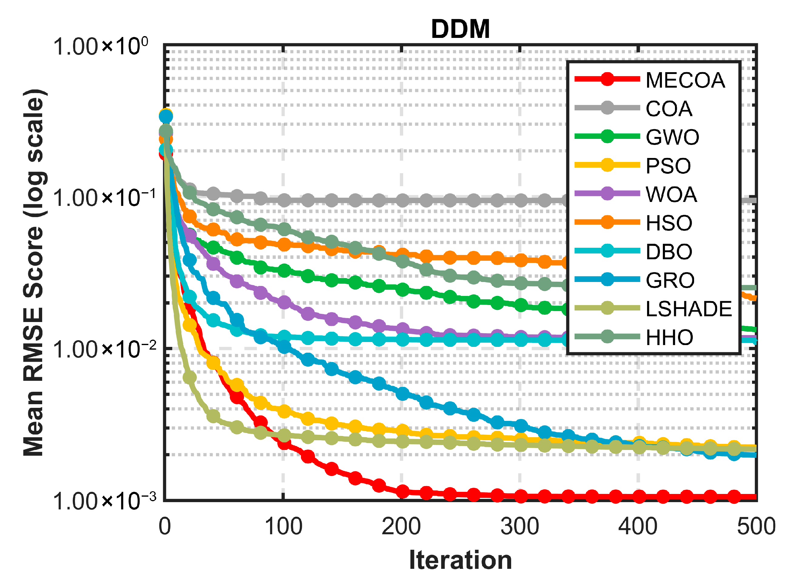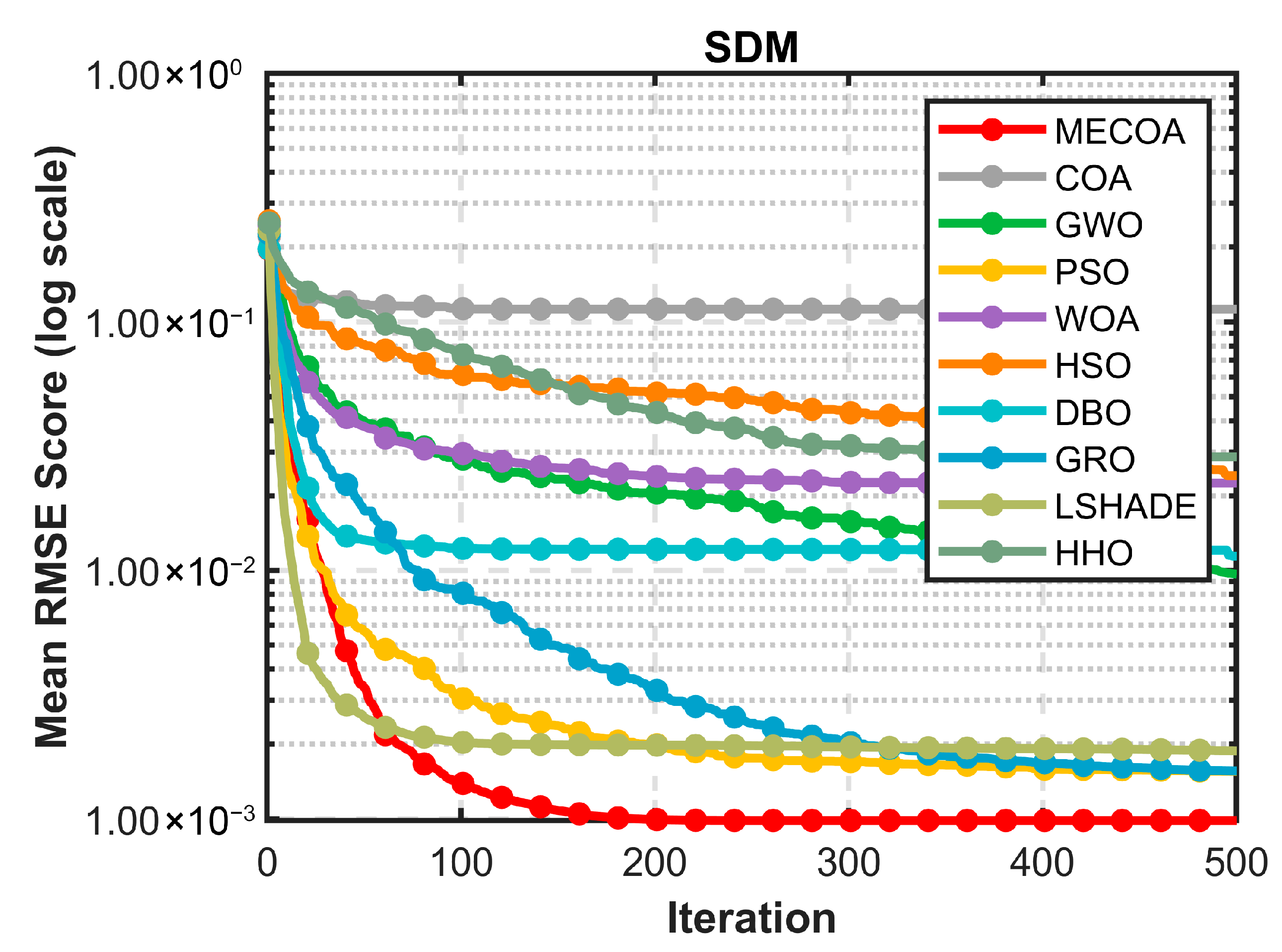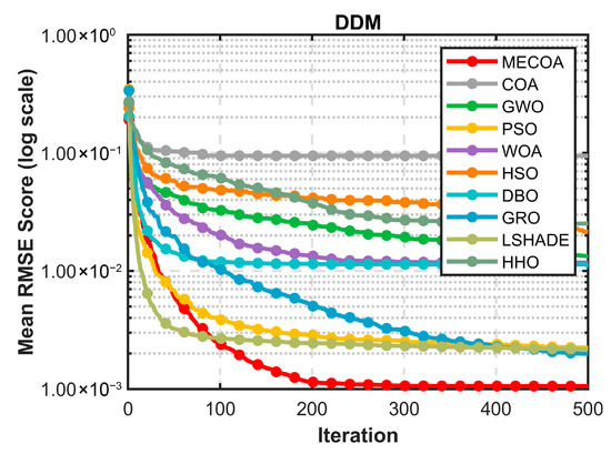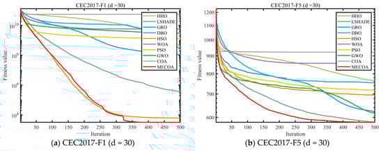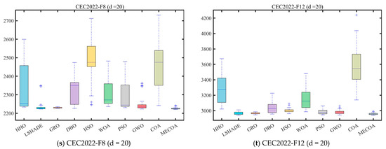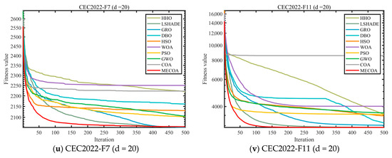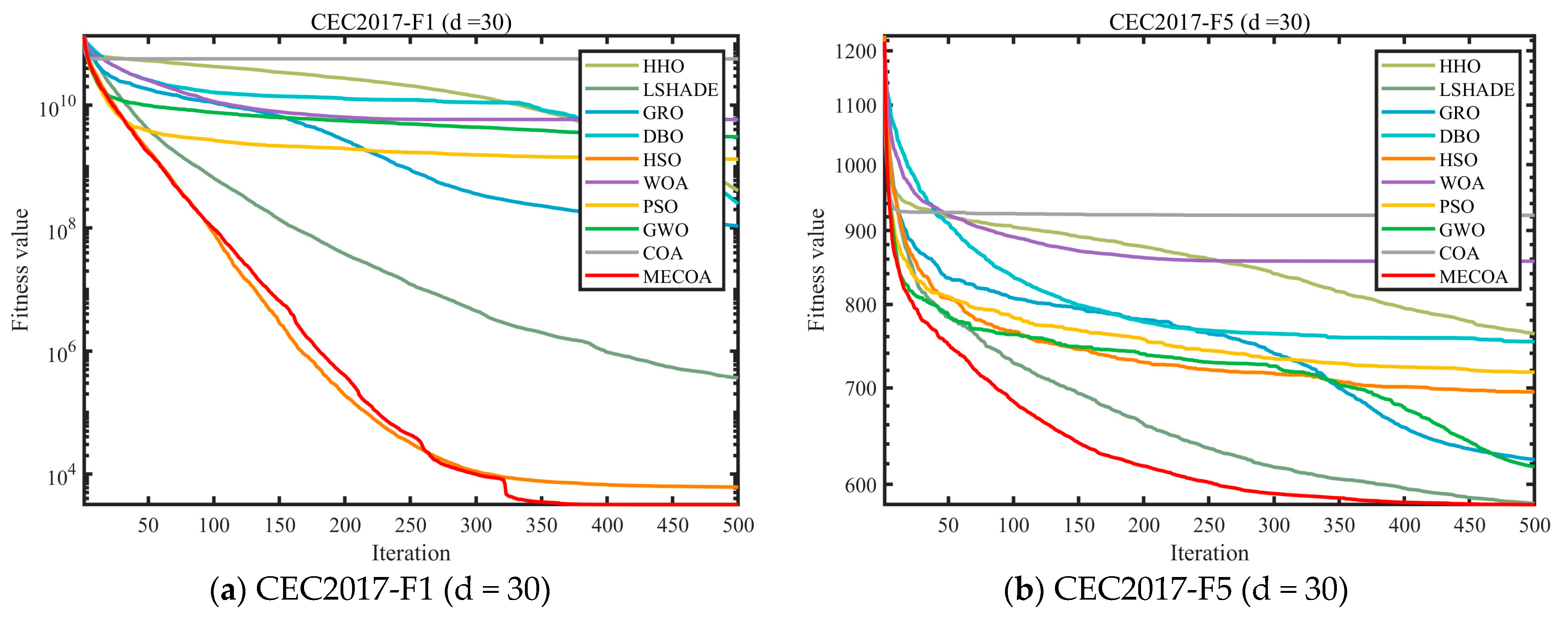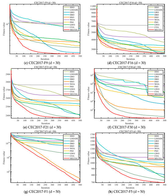 In this section, the superior performance of the proposed MECOA is validated through comparative experiments with eight state-of-the-art algorithms, including the Harris Hawks Optimization (HHO), Improving the search performance of SHADE using linear population size reduction (LSHADE), Gold Rush Optimizer (GRO), Grey Wolf Optimizer (GWO), Whale Optimization Algorithm (WOA), Particle Swarm Optimization (PSO), Holistic Swarm Optimization (HSO), Dung Beetle Optimizer (DBO), and the standard Coati Optimization Algorithm (COA).