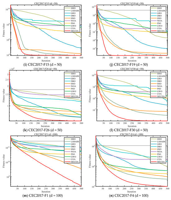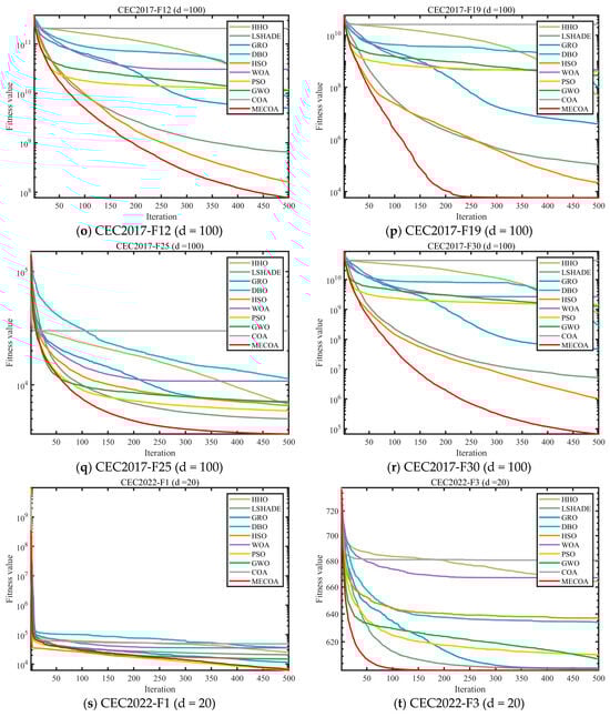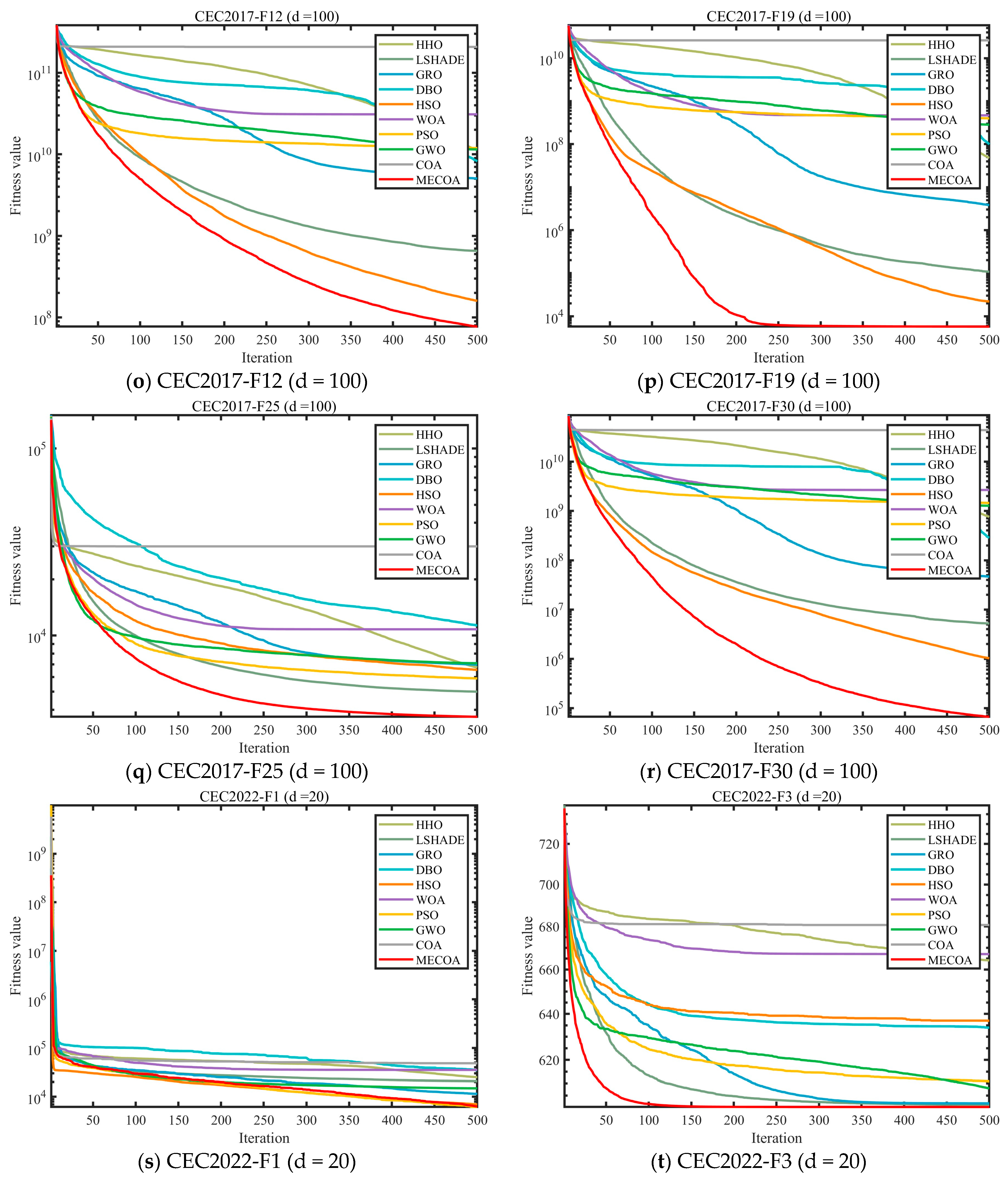 - Comprehensive benchmark validation: MECOA is compared against seven mainstream metaheuristic algorithms, including GWO, WOA, and PSO, on the CEC2017 (30/50/100-dimensional) and CEC2022 (20-dimensional) benchmark suites. The evaluation focuses on population diversity, exploration–exploitation balance, convergence speed, and accuracy, validating the superior optimization performance of MECOA.