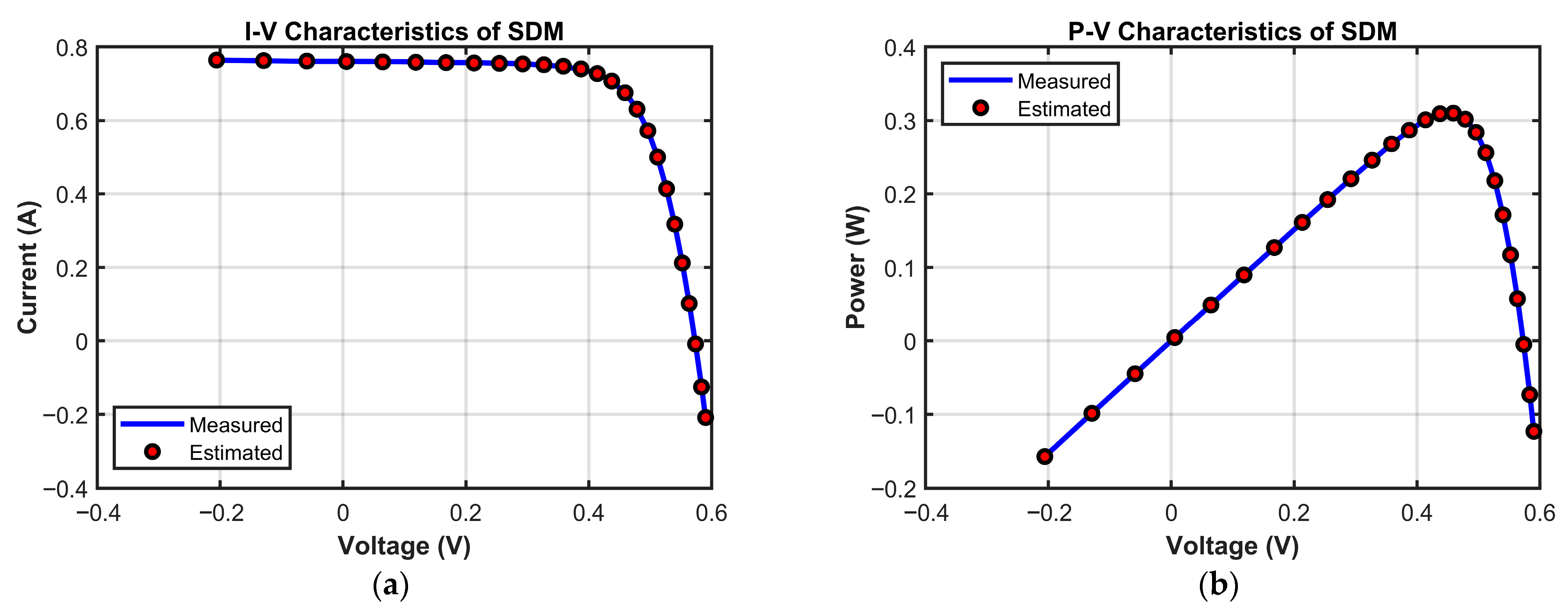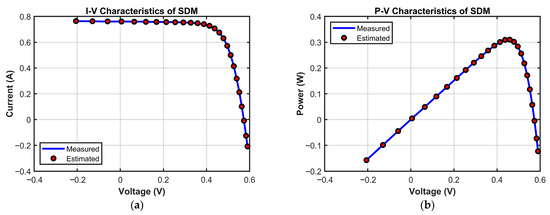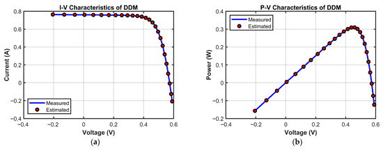 To characterize the electrical output behavior of PV cells and modules, various equivalent circuit models have been proposed. Among them, the single-diode model (SDM) and double-diode model (DDM) are the most widely adopted due to their balance between modeling simplicity and fitting accuracy. The SDM represents the core operating mechanism of PV devices using a photocurrent source, a diode, a series resistance, and a shunt resistance. It requires the estimation of five parameters: photocurrent , diode reverse saturation current , diode ideality factor , series resistance , and shunt resistance . The DDM further accounts for recombination losses in the depletion region of the semiconductor by introducing a second diode, thus adding two more parameters—the saturation current of the second diode and the diffusion factor —bringing the total to seven [4,5,6]. However, the mathematical formulations of both models involve implicit transcendental equations with strong inter-parameter coupling, and the parameter values are highly sensitive to external conditions. Consequently, parameter extraction for PV models faces the triple challenge of high dimensionality, strong nonlinearity, and multiple constraints. These factors make it difficult for traditional methods to achieve high-precision identification, thereby limiting the effectiveness of PV system modeling and optimization in practice [7,8].