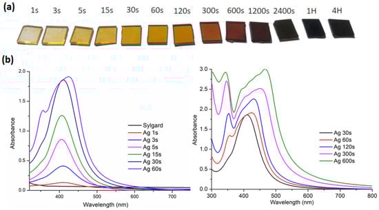 (a) Photographs of Sylgard 184 incorporating silver nanoparticles at increasing immersion durations in the silver solution; (b) UV–visible absorption spectra of Sylgard 184 after immersion in the silver solution for varying times.