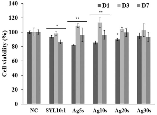 Cell viability of pure Sylgard 184 and Sylgard 184 samples immersed in the silver solution for different durations, compared to the negative control. Data are presented as mean ± SD of 3 independent experiments (n = 9). * p < 0.05 and ** p < 0.001 indicate statistically significant differences.