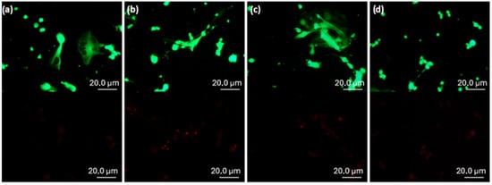 To further evaluate the cytotoxicity of the samples, a Live/Dead staining assay was performed after 24 h of incubation. Representative fluorescence images of the tested samples are shown in Figure 9.
