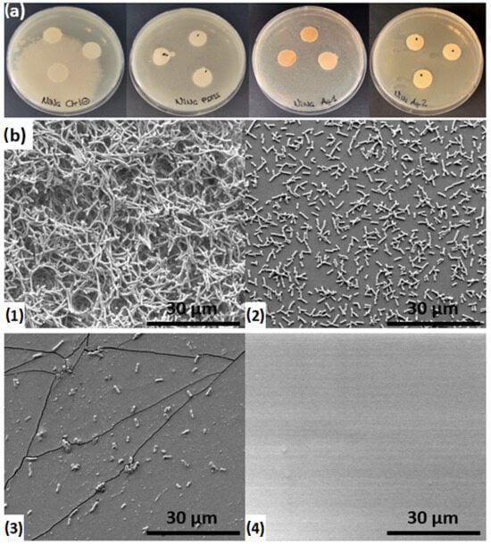 SEM images of the four samples were obtained after fixation of bacterial colonization, as shown in Figure 10b. The surface of the control sample (Figure 10(b1)) was completely covered with bacteria, forming thick multilayered colonization. The underlying substrate was not visible, as the high density of E. coli bacterial cells formed a biofilm on the surface. The Sylgard 184 sample (Figure 10(b2)) also exhibited bacterial colonization, with cells distributed homogeneously across the surface; however, the bacterial density was lower, and the substrate surface remained partially visible. The Ag5s sample (Figure 10(b3)) displayed only a few bacteria on its surface, while the Ag30s sample (Figure 10(b4)) appeared entirely free of bacterial colonization.