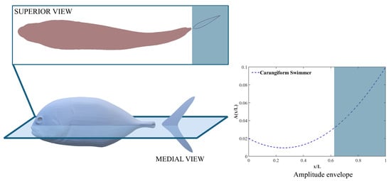 Nature perfects the art of efficient swimming, with countless aquatic species exhibiting intricate coordination of body fins to navigate water with remarkable ease. This observation has inspired numerous studies on biomimetic propulsion in recent years. Various factors, including climate change and pollution, continue to affect oceanic ecosystems [8], making the study of marine life and its adaptive locomotion increasingly important. Drawing inspiration from fish locomotion and their maneuvering techniques presents significant opportunities for the advancement of autonomous Underwater Vehicles (AUVs) [9]. Underwater exploration systems benefit from biologically inspired navigation strategies, as demonstrated in recent studies on odor dynamics that may guide robots in adapting to their environment [10]. Moreover, the integration of computational methods enables detailed exploration of fish behaviors using techniques, such as deep recurrent Q networks (DRQN) combined with the Immersed Boundary–Lattice Boltzmann Method (IB–LBM), optimizing tasks like Kármán gaiting and prey capture [11]. These advancements mark a critical step in marine robotics and underwater innovation. The undulatory kinematics of fish help them maneuver and swim efficiently underwater. Carangiform swimmers show relatively larger displacements in the posterior end of the body, with undulatory motion concentrated near the peduncle and the caudal fin. Numerous studies discuss the importance of the shape and size of the peduncle and the caudal fin on fish locomotion [12,13]. In Figure 1, the superior view of a Jack fish is shown to demonstrate the flexion of the body in its undulatory state. The amplitude envelope on the right shows that the maximum displacement occurs toward the posterior end of the fish, exhibiting a typical carangiform swimming mode.