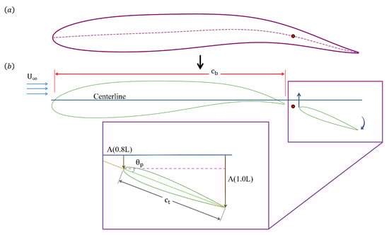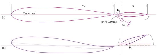 A common modeling approach approximates the body of a carangiform swimmer as a single airfoil [10,24,25,26,31], as illustrated in Figure 7a. In this study, we instead adopt a biomimetic two-foil configuration, representing the body and tail as separate foils, as shown in Figure 7b. To ensure a consistent tail trajectory across all cases, the prescribed flapping motion is constrained so that the centerlines of the body and tail remain continuous. The amplitude trailing-edge amplitude of the tail is matched to the undulatory envelope of a carangiform swimmer at the posterior section of the body, with a maximum lateral amplitude of . Since the geometry and flow conditions are identical for both the actively and passively pitching tails, a direct comparison can be made to evaluate how hydrodynamic performance changes when the kinematics of the tail are switched from active to passive. In this framework, the heaving displacement of the tail is prescribed to follow the undulation of the body at its peduncle, while the kinematics of the tail with active pitching is defined by Equation (10).