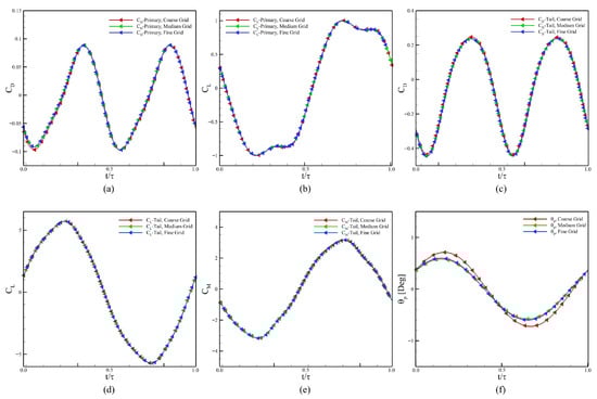 Results for the convergence of the grid size, (a) of the main body, (b) of the main body, (c) for the tail, (d) of the tail, (e) (pitching moment coefficient) of the tail, and (f) the pitching amplitude of the tail.