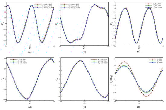 Next, we proceed with the time step-independence study, for which we choose three values of the time step size () so that the results stay unaffected by the selection of . We chose and 10,000 time steps per oscillation cycle for this study. Figure 5 shows the comparison of the hydrodynamic force and moment coefficients for the body and the tail for one complete undulation cycle. Based on profiles of the pitching angle of the tail, we choose to proceed with according to 7500 time steps in one undulation cycle.