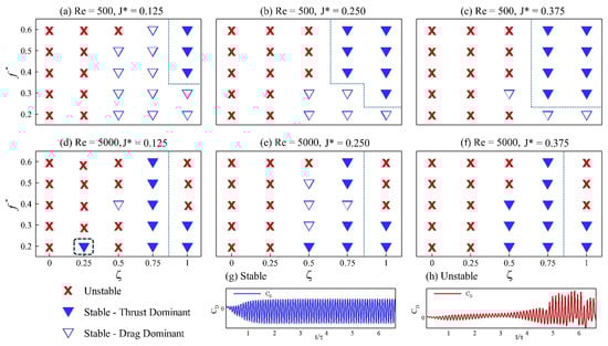 Before discussing the dynamics of the swimmer with a passively pitching tail, we note that a total of 150 numerical simulations are performed. The responses are categorized into three modes: stable drag-dominated, stable thrust-dominated, and unstable. This classification is summarized in Figure 8, which we refer to as the stability maps, constructed for different sets of kinematic and flow parameters. The classification is based on 40 oscillation cycles. A case is considered stable if the flow reaches a periodic steady state within this window; otherwise, it is classified as unstable. Stability is determined using the drag coefficient (): if a case fails to reach a steady state (Figure 8h), the case is labeled as unstable, whereas cases that converge to steady periodic behavior (Figure 8g) are labeled stable. Although steady state is typically achieved within 5–8 cycles, 40 cycles are simulated to ensure complete decay of transient effects and convergence to steady state. Stable cases are further categorized using the mean drag coefficient (). If , the case is classified as stable drag-dominated; if , it is classified as stable thrust-dominated.