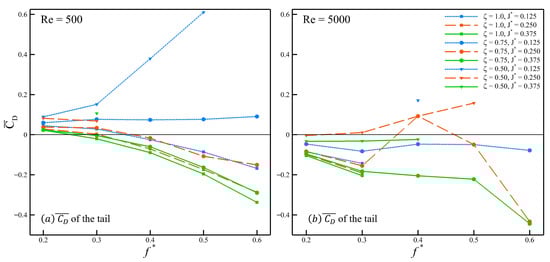 We now turn to the passively pitching tail and analyze its drag coefficient for all stable cases. It allows us to assess how the transition from active to passive pitching influences the performance of the swimmer, based on the mean drag coefficient presented in Figure 10. Figure 10a and Figure 10b show the mean drag coefficient () of the tail at Re = 500 and Re = 5000, respectively. From Figure 10a, the first observation is that the configuration with and exhibits an increasing (i.e., decreasing thrust) as the increases to . Beyond this point, at , the case becomes unstable. Secondly, for the same value of inertia () but with a higher , the trend remains nearly constant across the range of Strouhal frequencies considered here. When this trend is compared to that of at a large shift, increasing the damping ratio shows a reduction of . Further increasing the damping ratio (), the trend shows a behavior similar to that of the actively pitching tail where the thrust increases as the Strouhal frequency is increased. Finally, examining the stable cases with a passively pitching tail, at for a range of inertia values (–), neither of the cases fully transition towards producing positive thrust (). However, all of the cases display a reduction in drag with an increase in inertia, and this trend of drag reduction with a higher inertia is consistently observed for all damping ratios chosen for this work.
