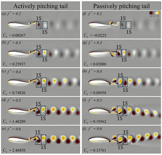We first examine the vortex dynamics of the swimmers at Re = 500, as shown in Figure 12. The first column (Figure 12a–e) presents the contours of vorticity for cases with an actively pitching tail, whereas the second column (Figure 12f–j) corresponds to the cases with a passively pitching tail. For each case, we report the , to quantify the propulsive performance associated with the observed wake structures. In Figure 12, denotes a single vortex shed into the wake during a half oscillation cycle.